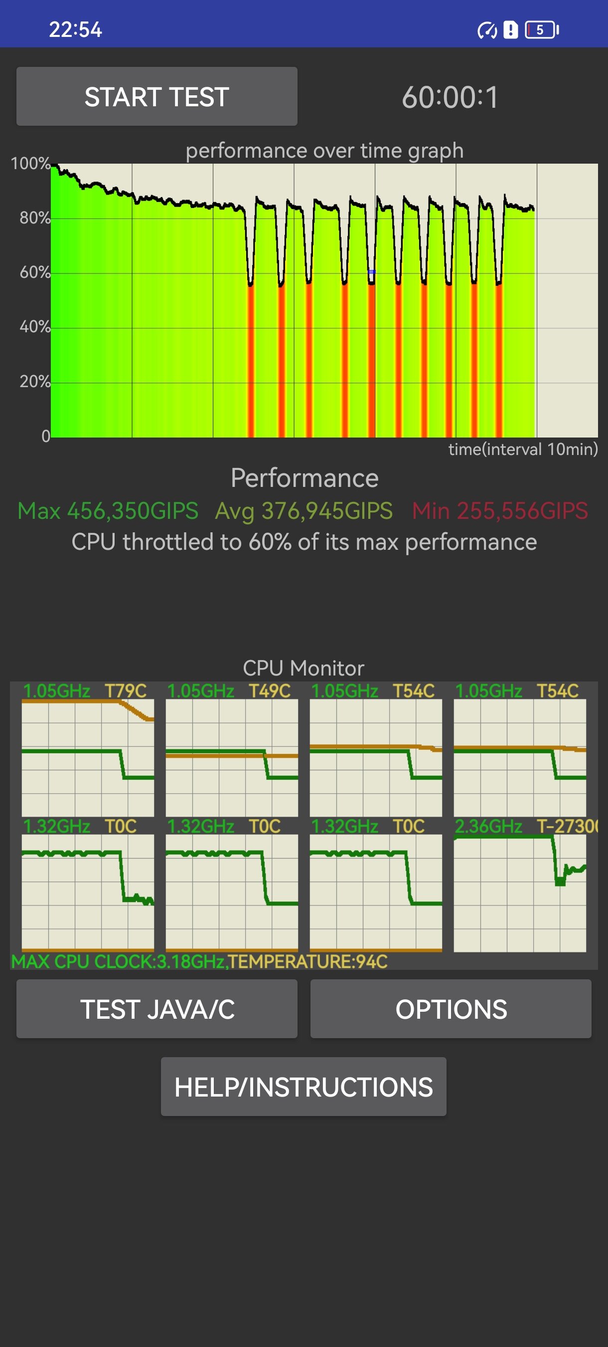 По классике в настройках питания можно обнаружить пункт с режимом повышенной производительности. Глобально он влияет лишь на график, полученный во время троттлинг-теста. При его активации частота периодов снижения производительности сокращается, а нижний предел просадок повышается с 220 до 255 тысяч GIPS. Результаты двух режимов практически не отличаются между собой, и отличить их можно разве что по значку условного тахометра в верхнем правом углу экрана.