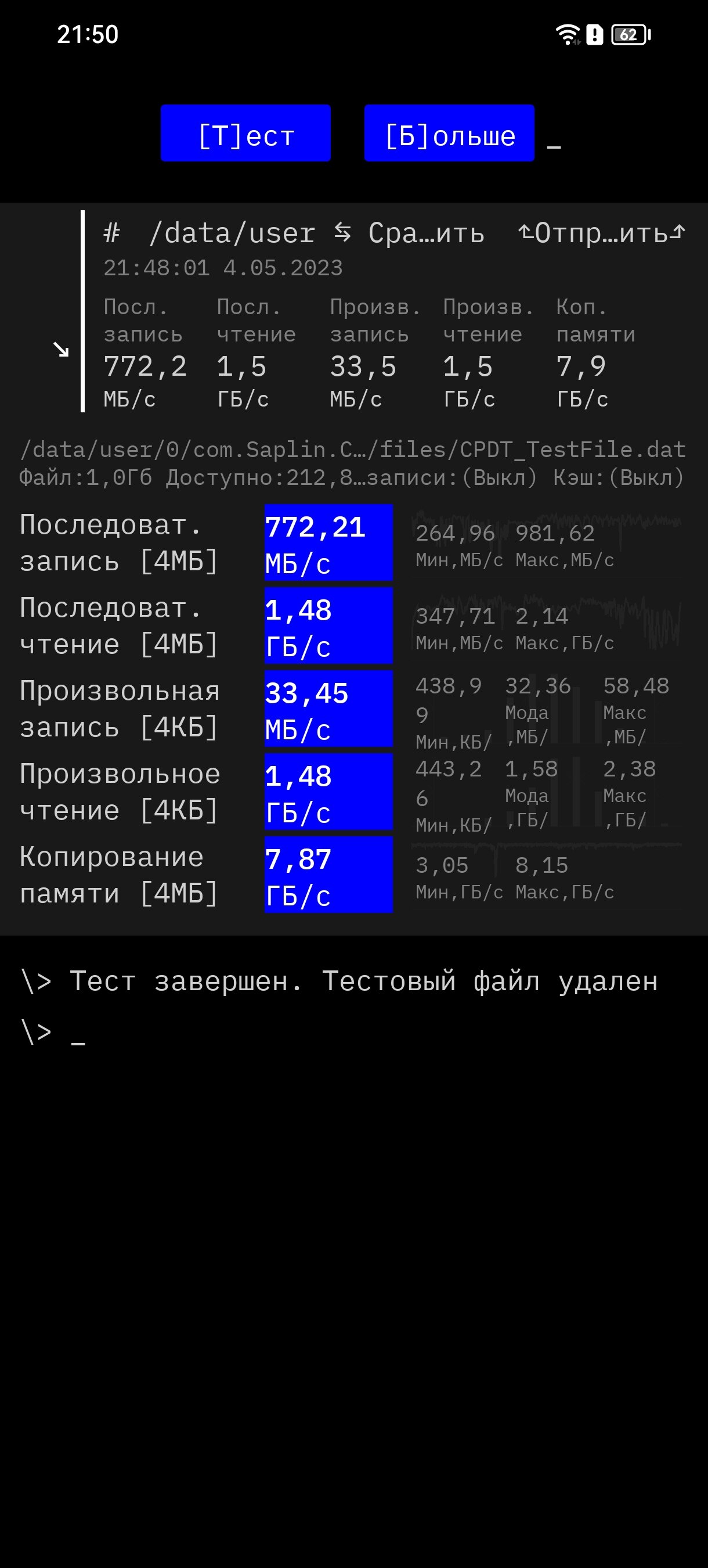 Производитель не распространяется о поколении встроенного накопителя на 256 ГБ. Однако, осмелюсь предположить, что это UFS 3.1, судя по довольно высокой скорости записи (более 700 МБ/с) и чтения (более 1,5 ГБ/с). Для многозадачности пользователю отведено 8 ГБ оперативной памяти, без возможности расширения посредством виртуального накопителя. Её скорость более чем флагманская и составляет около 36 ГБ/с, если верить результатам бенчмарка A1 SD Bench.