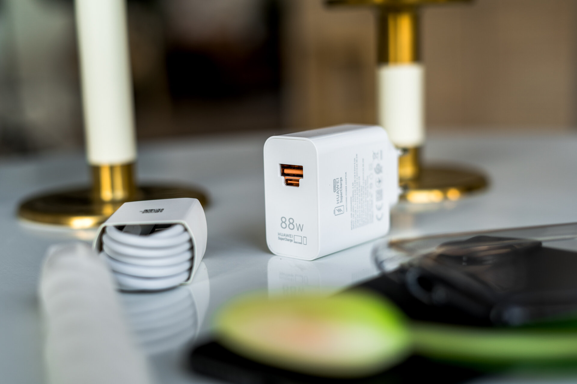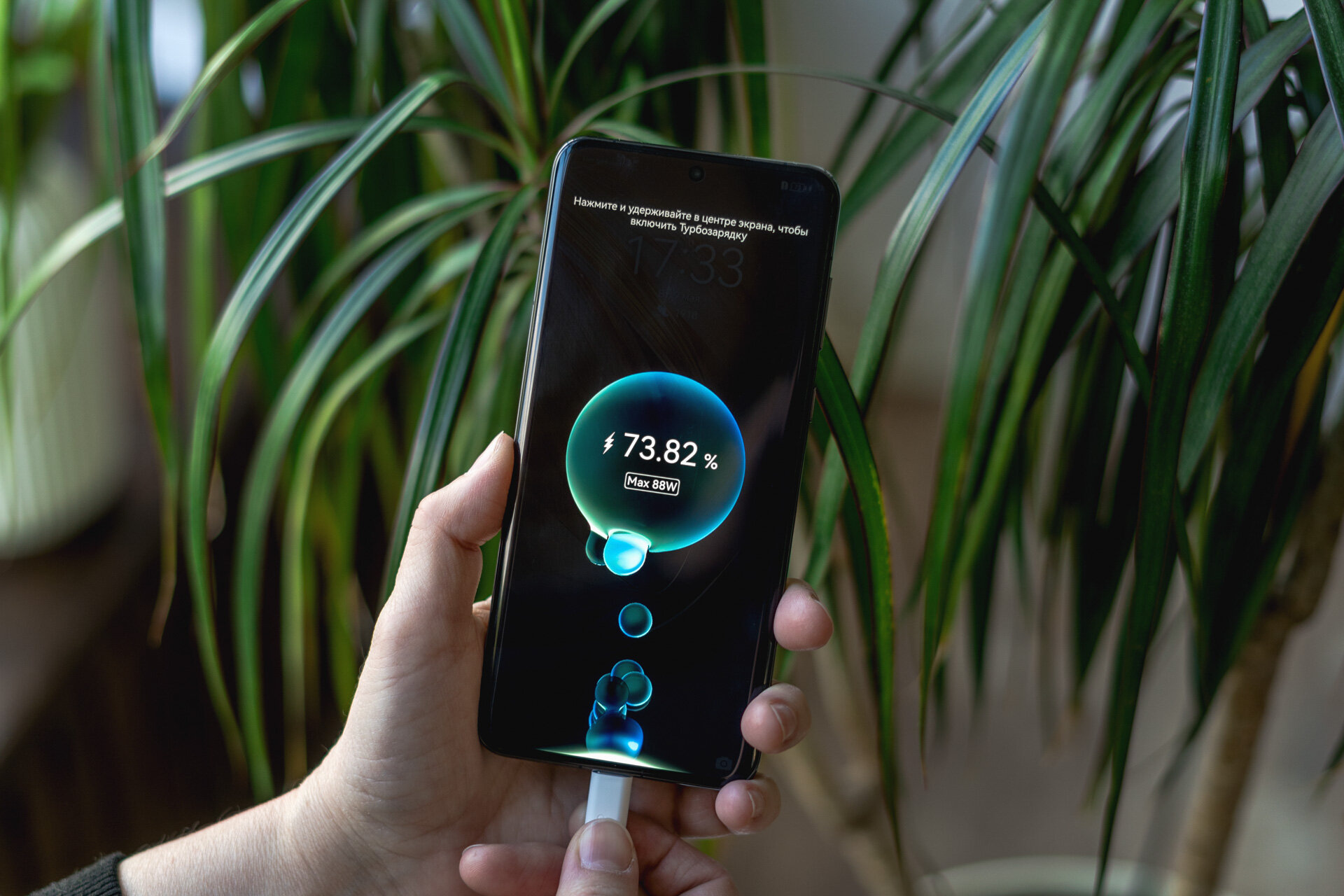 Комплектуется герой обзора универсальным блоком питания сразу с двумя интерфейсами. Воспользоваться ими одновременно не получится ввиду слишком тесного размещения, да и ток подается только на один разъем. Но решение интересное и радует, что не надо зависеть от типа кабеля. Выходную мощность адаптер поддерживает до 88 Вт. С его помощью Huawei P60 Pro заряжается всего за 35 минут, если активировать турборежим по нажатию на анимированный значок на экране.