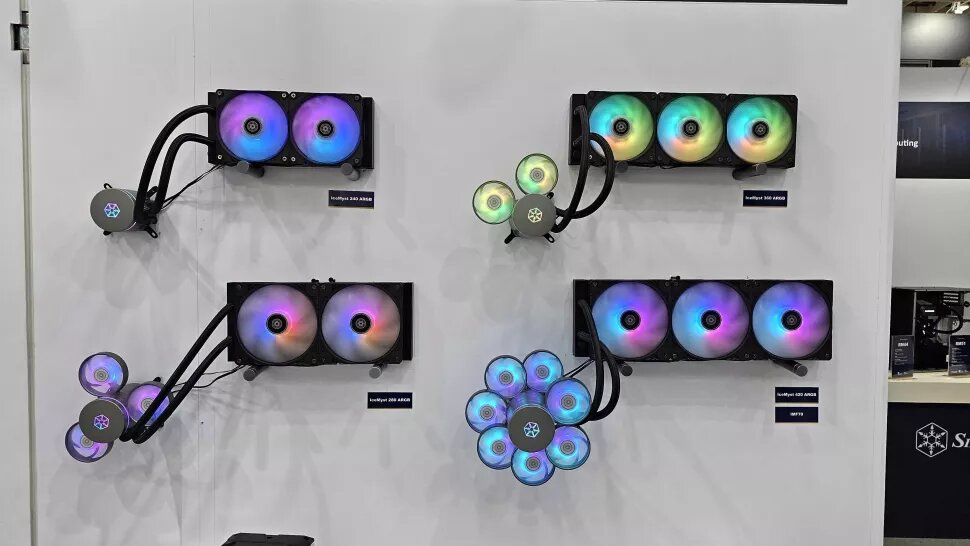 Кроме того, в SilverStone объяснили, что в линейке IceMyst будет несколько моделей с различной компоновкой компонентов. Будут варианты на две и три секции радиатора, то есть 240 и 360 мм, при этом количество вентиляторов на помпе стартует с двух и заканчивается топовой моделью на семь единиц. Впрочем, как топовая модель будет уживаться с видеокартой, которая явно будет упираться в вентиляторы, пока что не совсем понятно, но и СЖО, представленная на выставке, является лишь демонстрацией возможностей — к моменту релиза, вероятно, останутся более адекватные решения на два-три вентилятора.