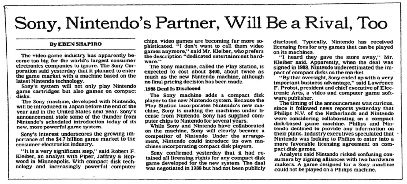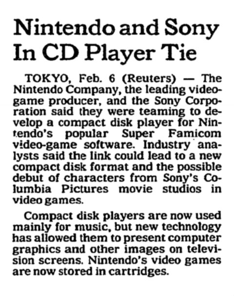 «Система Sony будет воспроизводить не только игровые картриджи Nintendo, но и игры на компакт-дисках», — цитата из материала Эбена Шапиро (Eben Shapiro).