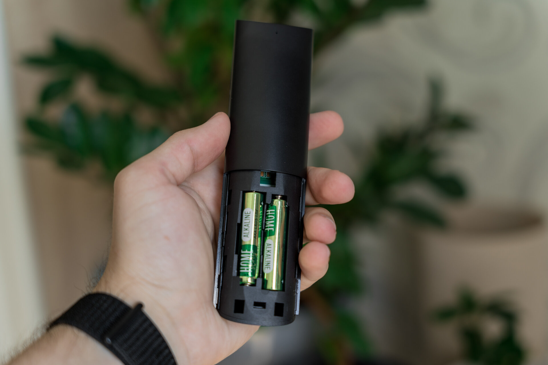 Пульт дистанционного управления выполнен из легкого матового пластика. Производитель не включает в комплект мизинчиковые батарейки, поэтому для его работы потребуется найти их самостоятельно. Пришлось разоружить один из своих.
