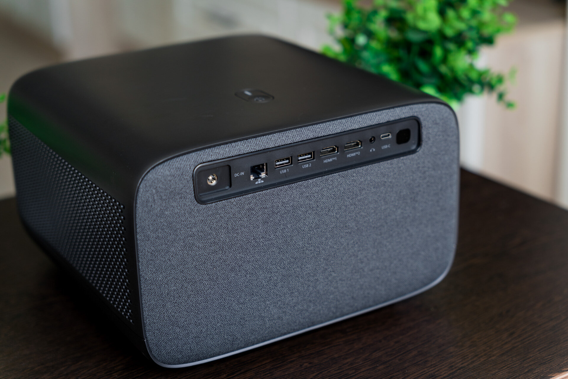 Не буду долго останавливаться на дизайне. Спереди расположена главная линза, обрамленная аккуратной пластиковой рамкой с логотипом бренда. Во время эксплуатации заметил, что силиконовая защитная заглушка на линзу не устанавливается, если проектор был сфокусирован на близком расстоянии от экрана. С правой стороны находится объектив для автоматической настройки трапеции и фокусировки, что упрощает процесс настройки изображения.