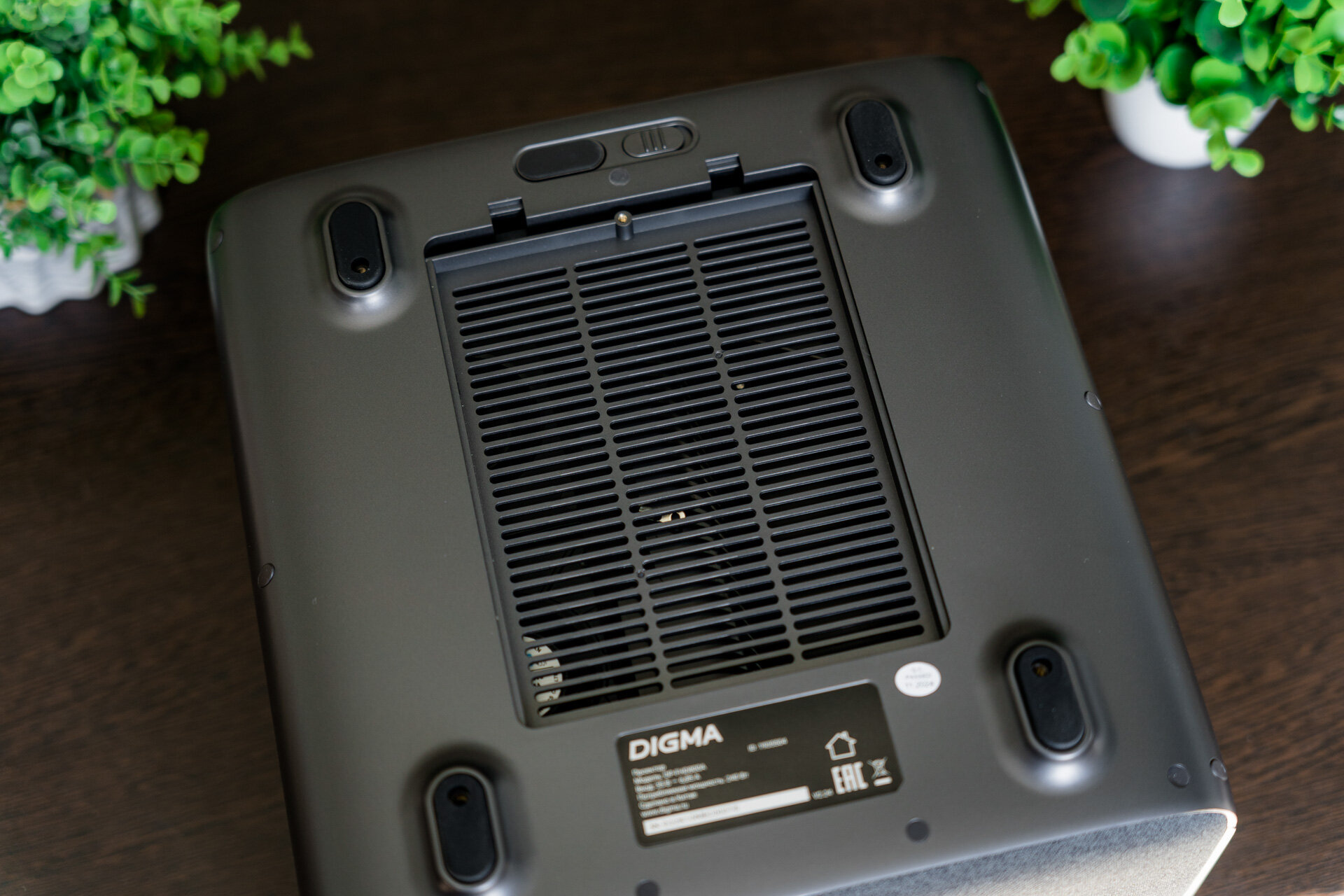 На нижней стороне проектора расположена перфорированная заглушка, под которой скрывается фильтр. Четыре прорезиненные ножки обеспечивают надежное сцепление с гладкими поверхностями, предотвращая скольжение. Небольшая выдвижная стойка позволяет регулировать высоту в небольшом диапазоне. А вот креплений или резьбы для установки на подвесном кронштейне в конструкции я не заметил.