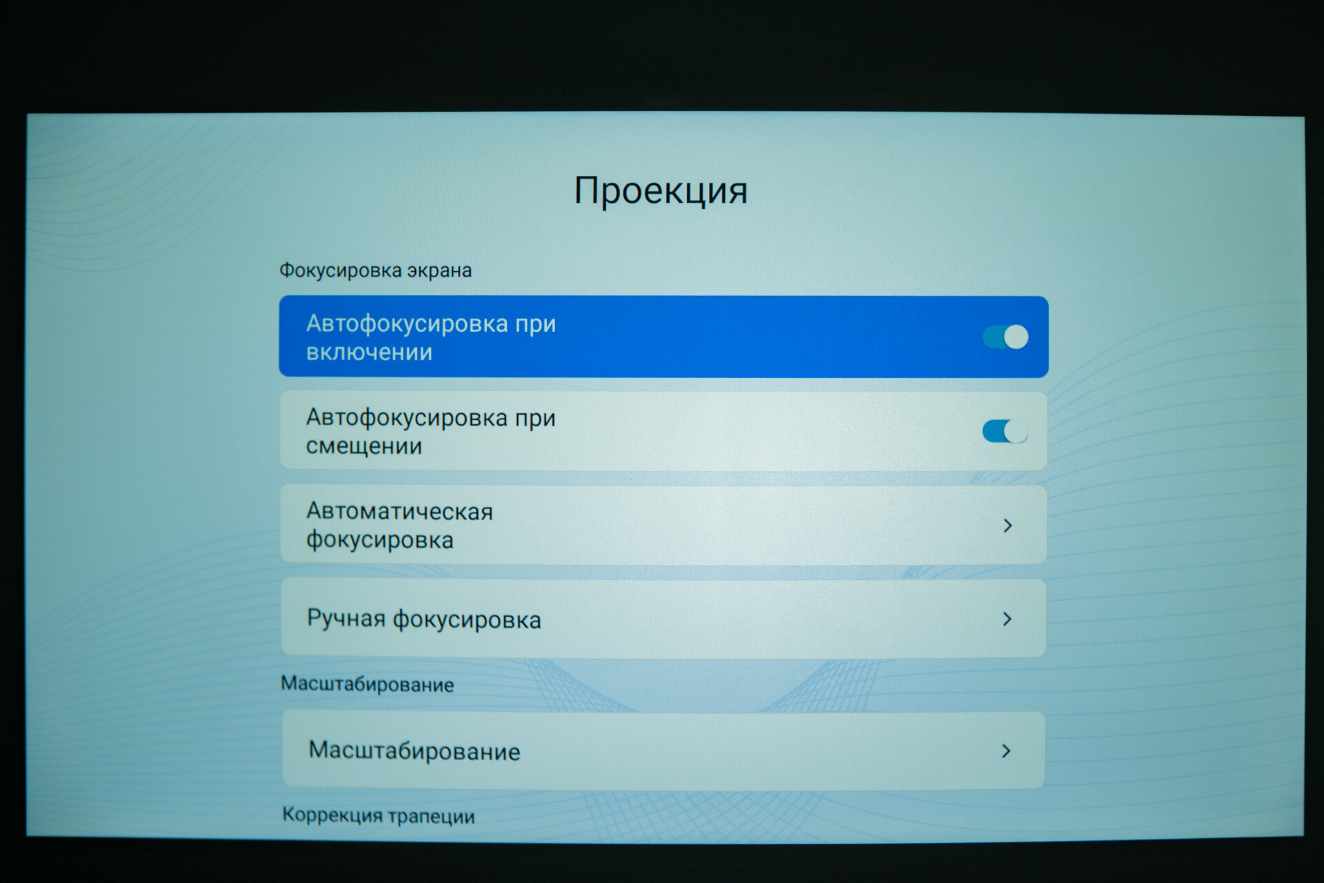 Настройки проектора несколько ограниченные. В основном доступны только функции фокусировки, коррекции трапеции и выбора метода проекции. Другие параметры настройки достаточно скромны: можно лишь поиграться с режимом ожидания или просмотреть информацию о версии прошивки и серийном номере устройства. А хотелось бы иметь возможность настроить параметры изображения: яркость, контрастность, насыщенность. Из-за этого немного сдерживается возможности кастомизации, но, в целом, основных функций лично мне оказалось достаточно.