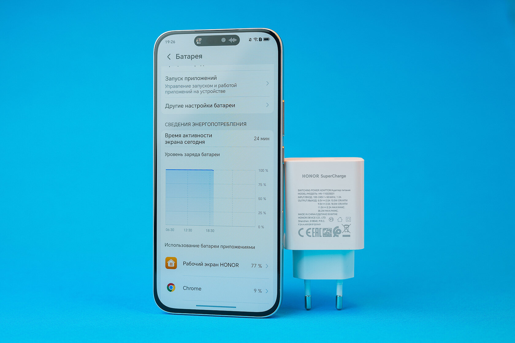 Ещё смартфон поддерживает проводную зарядку мощностью до 35 Вт (адаптер HONOR SuperCharge идёт в комплекте) — это позволяет полностью восполнить энергию батареи за 105 минут у розетки. Но куда важнее, что аккумулятор смартфона весьма износоустойчив — он сохранит свыше 80% от первоначальной ёмкости после 1000 циклов зарядки.
