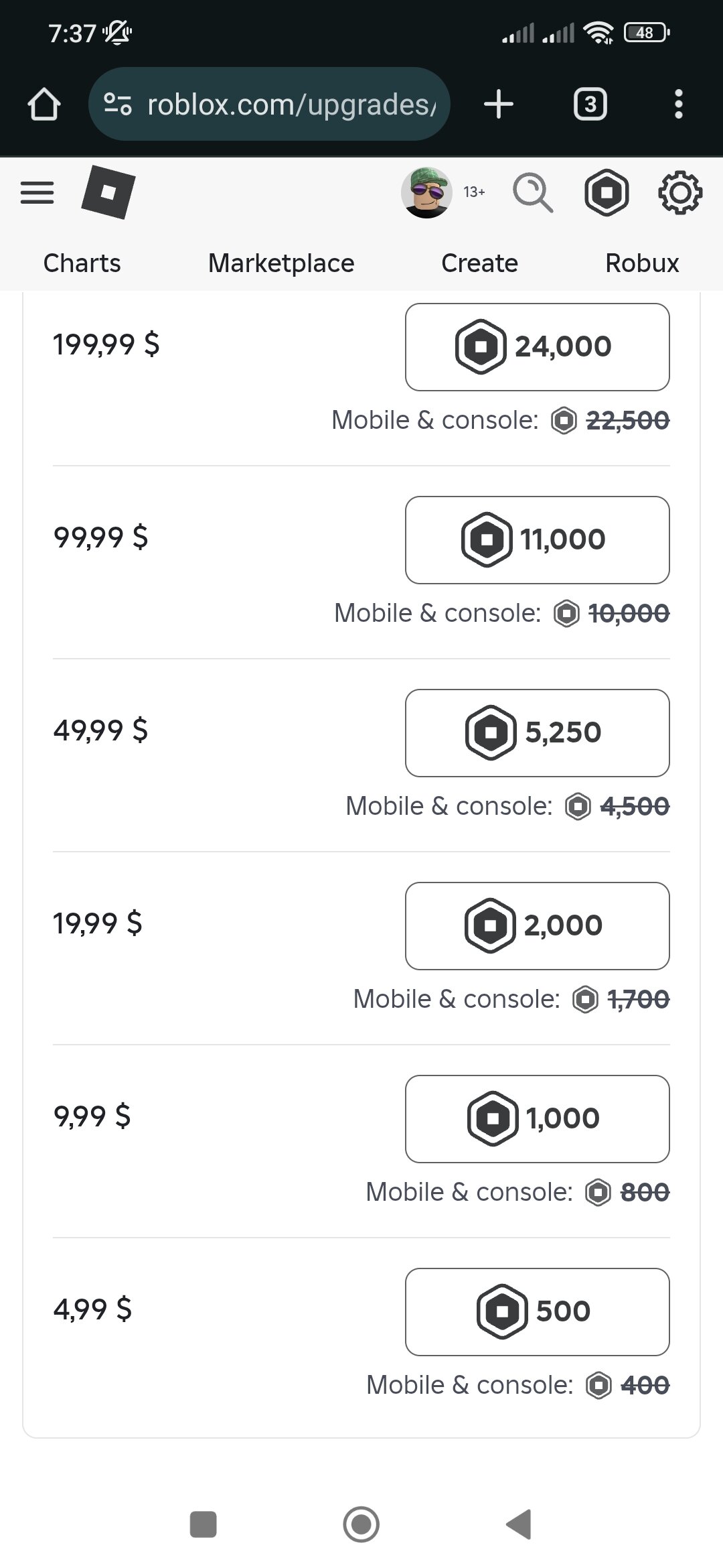 Геймерам, которым вышеперечисленные хитрости по получению бесплатных робуксов по тем или иным причинам не подходят, а купить прикольный скин или задонатить в игру очень хочется, настоятельно рекомендуется воспользоваться одним очень простым лайфхаком. Суть в том, что когда вы решите приобрести робуксы в официальном магазине, стоит покупать цифровую валюту не через мобильное приложение, а через браузер — на смартфоне или десктопе. В данном случае разработчики за одну и ту же сумму денег (при покупке через браузер) предоставляют больше робуксов.