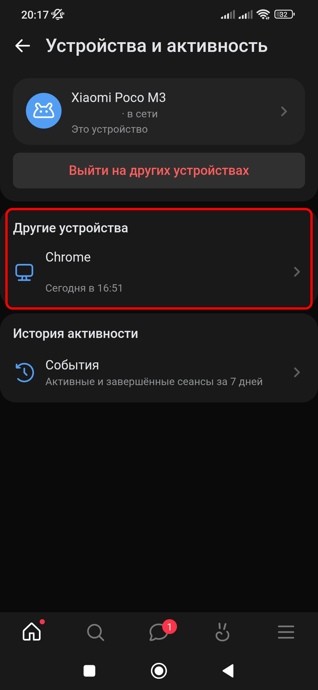 💡 Есть небольшой лайфхак — рекомендуется отключить все активные сессии, кроме текущей на смартфоне, и затем по мере необходимости заново входить в профиль на всех нужных устройствах. В этом случае вы будете уверены в том, что не сохранили сессию на гаджете постороннего человека.