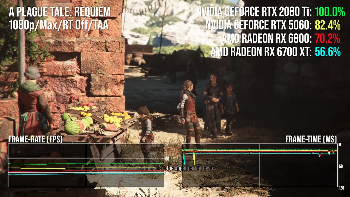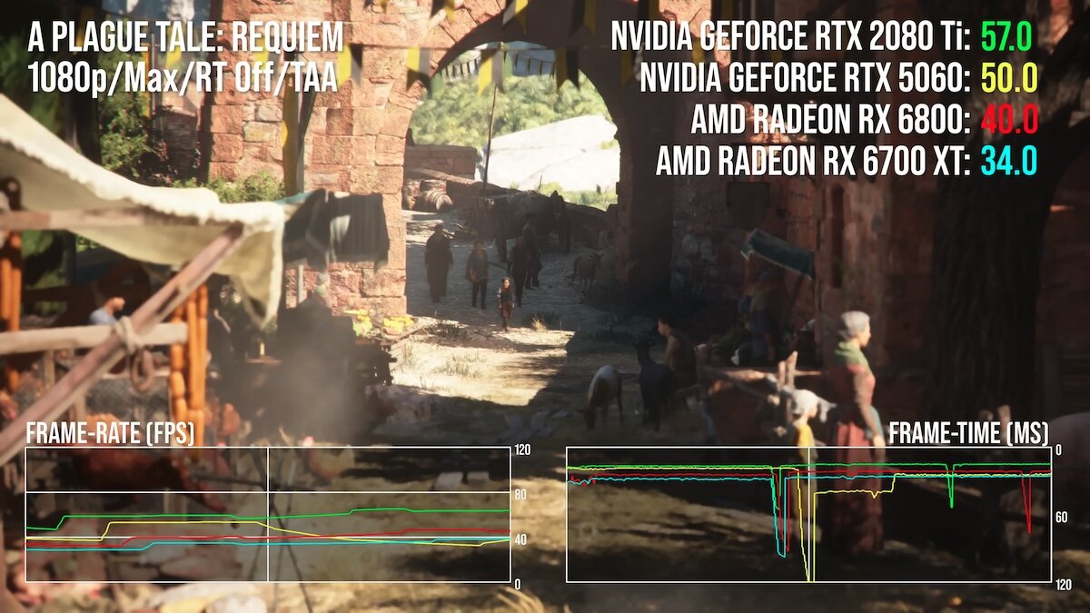 Вчера, 29 мая, автор с канала Digital Foundry выпустил довольно необычное видео, в рамках которого новую видеокарту доступного сегмента RTX 5060 на 8 ГБ видеопамяти сравнили с флагманом семилетней давности RTX 2080 Ti на 11 ГБ VRAM (ещё в тесте принимали участие RX 6800 и RX 6700 XT, но они в данном случае по ряду причин менее интересны). И оказалось, что топовая видеокарта в линейке RTX 20 в современных ААА-играх довольно часто обходит «бюджетную» модель NVIDIA нового поколения. Например, в A Plague Tale: Requiem «старичок» демонстрирует в среднем 57 FPS, тогда как RTX 5060 набирает всего 50 кадров в секунду — это +17,6% в пользу карты семилетней давности.