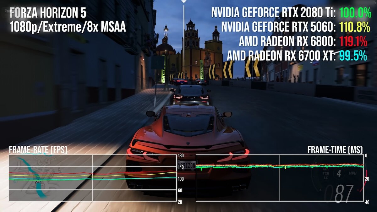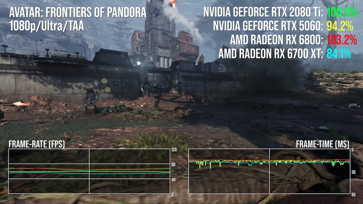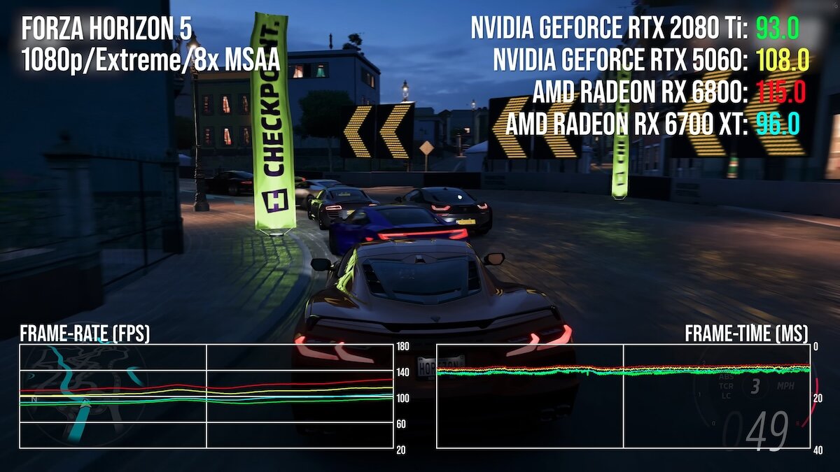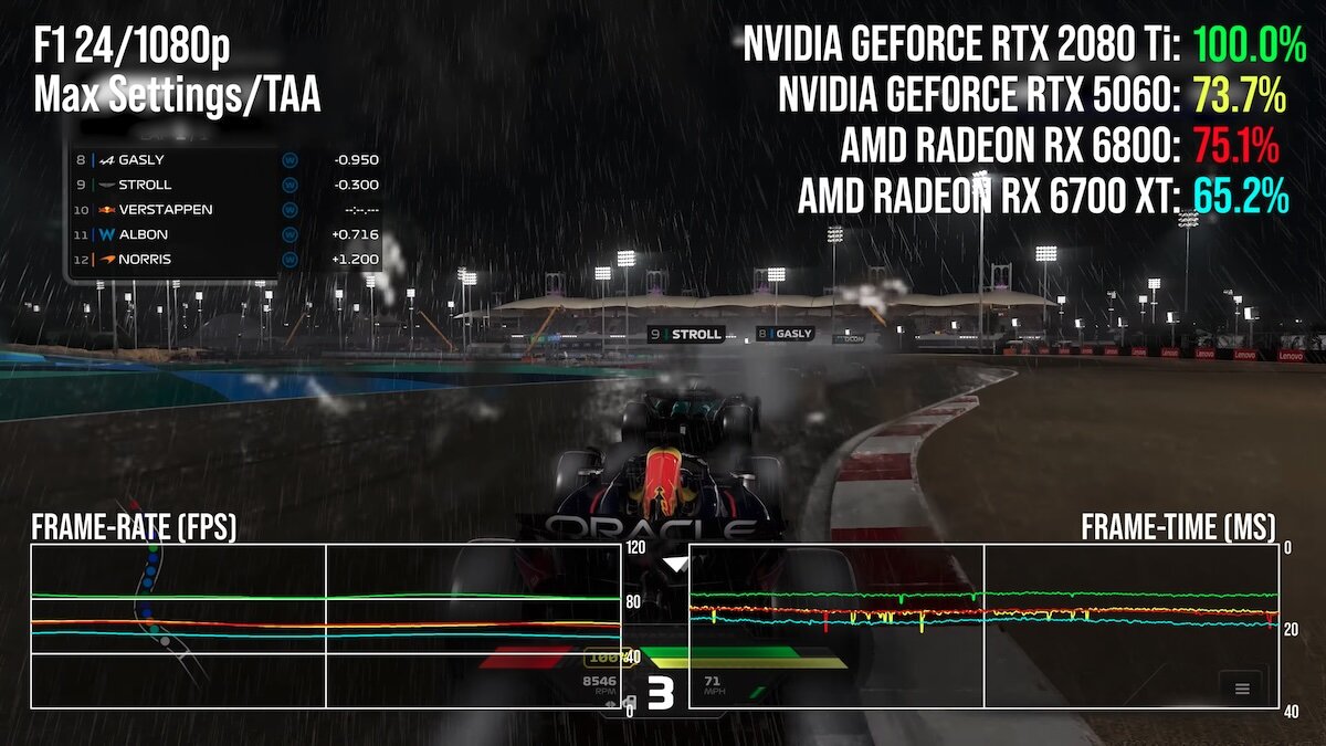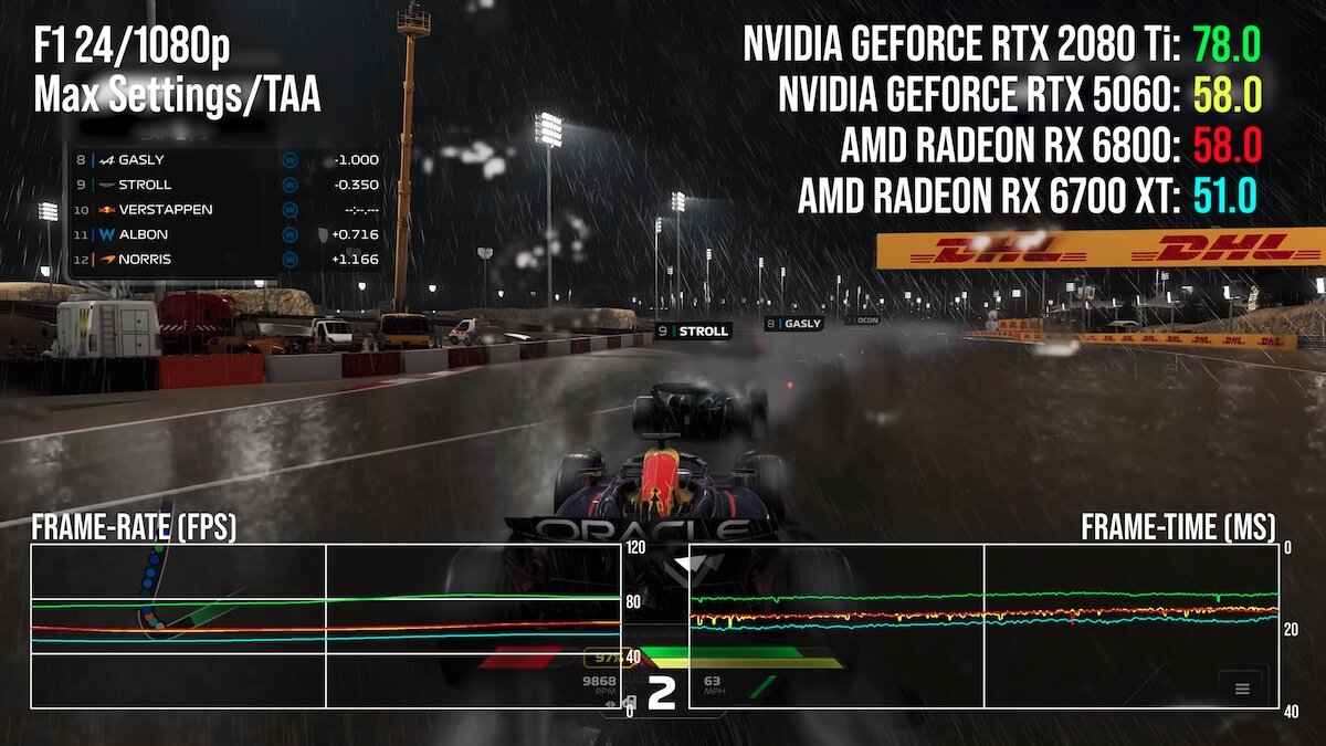 В гоночном симуляторе F1 24 ситуация ещё более грустная (для новинки) — RTX 2080 Ti в 1080p на максимальных настройках графики отображает 78 FPS, тогда как у RTX 5060 фреймрейт на 20 кадров в секунду ниже.