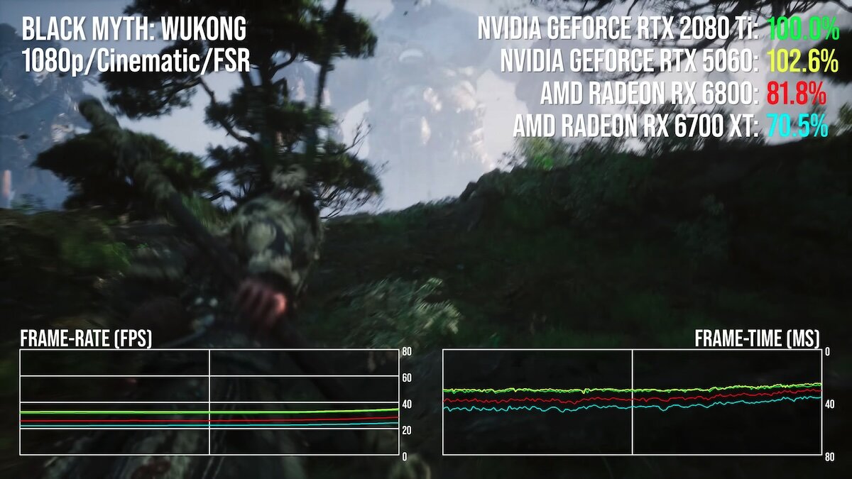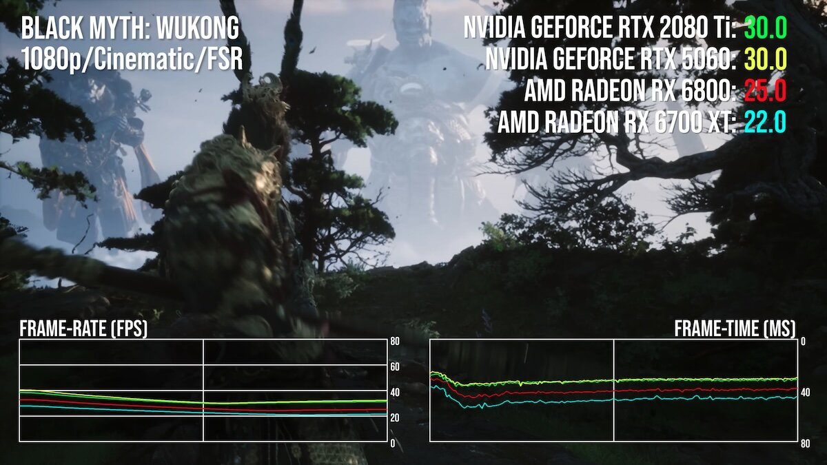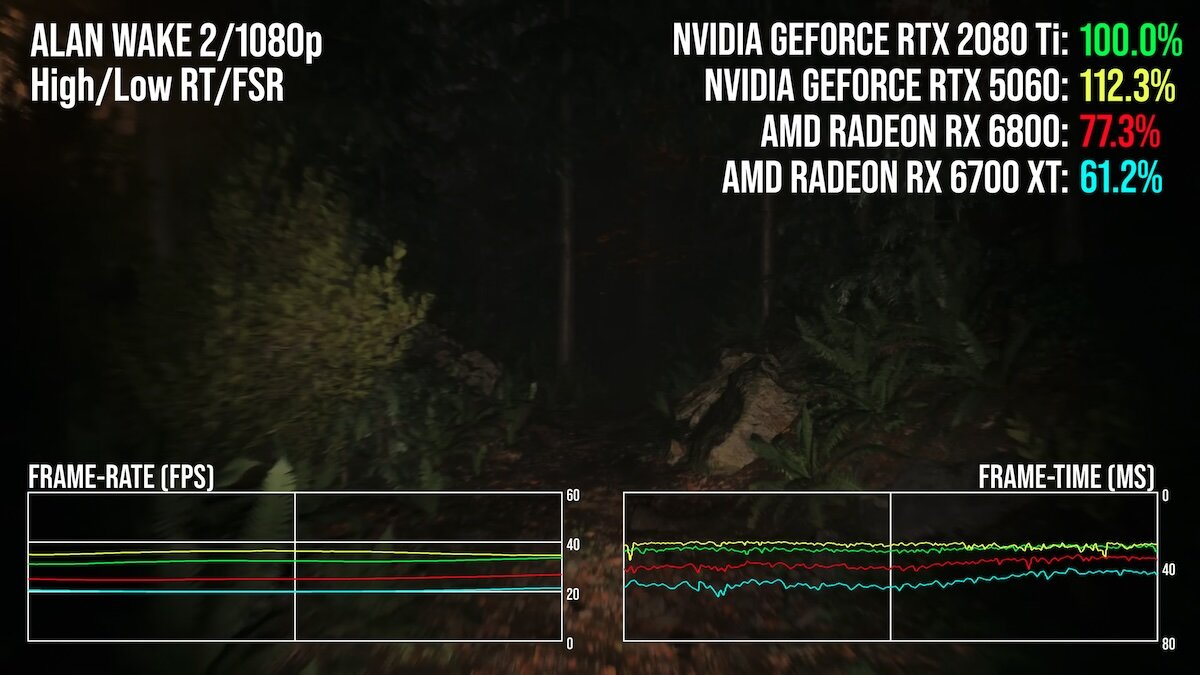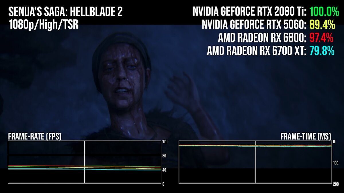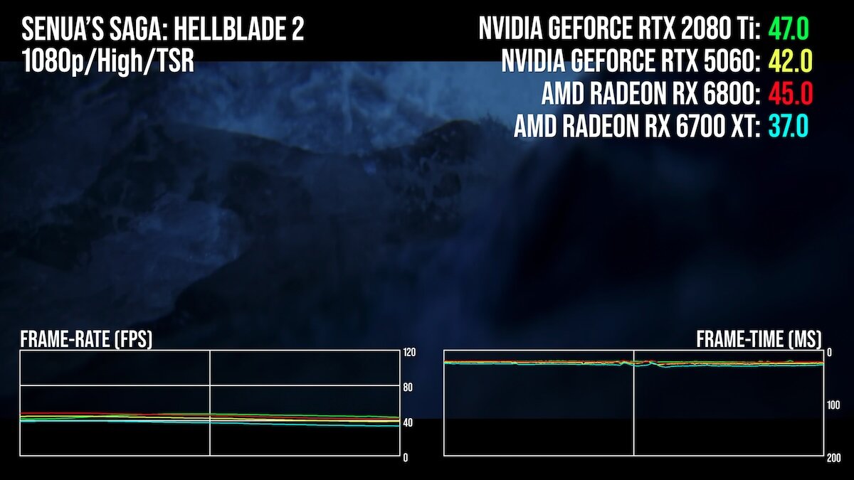 А в Senua's Saga: Hellblade II у свежей карты наблюдаются катастрофические проблемы. Глобально карта уступает модели RTX 2080 Ti всего 5 FPS в среднем, но в рамках игрового процесса из-за скудного объёма памяти RTX 5060 иногда просаживает частоту кадров до 18 FPS — это выглядит достаточно неприятно, особенно если учесть, что такие просадки будут происходить регулярно.