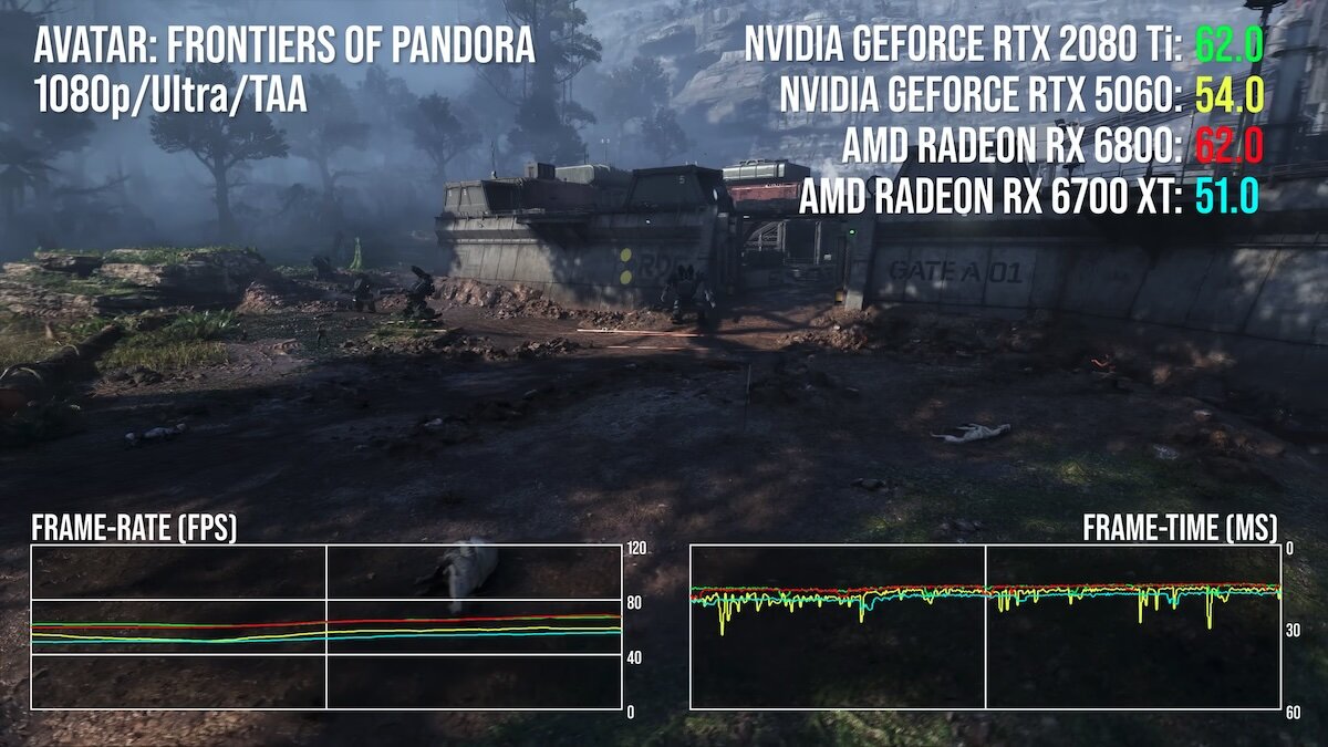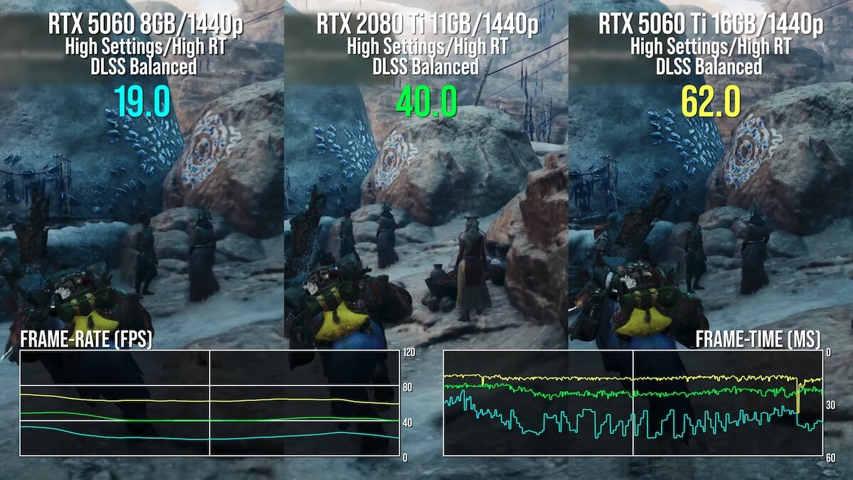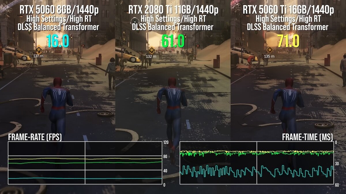 Примечательно, что это не единичный случай — в играх Marvel’s Spider-Man 2 и Monster Hunter Wilds с активированной трассировкой лучей RTX 5060 моментами не хватает видеопамяти, из-за чего в нагруженных эффектами сценах график частоты кадров резко уходит в пропасть. У RTX 2080 Ti в этих же сценах никаких проблем с FPS не наблюдается — видимо, 11 ГБ всё же хватает.