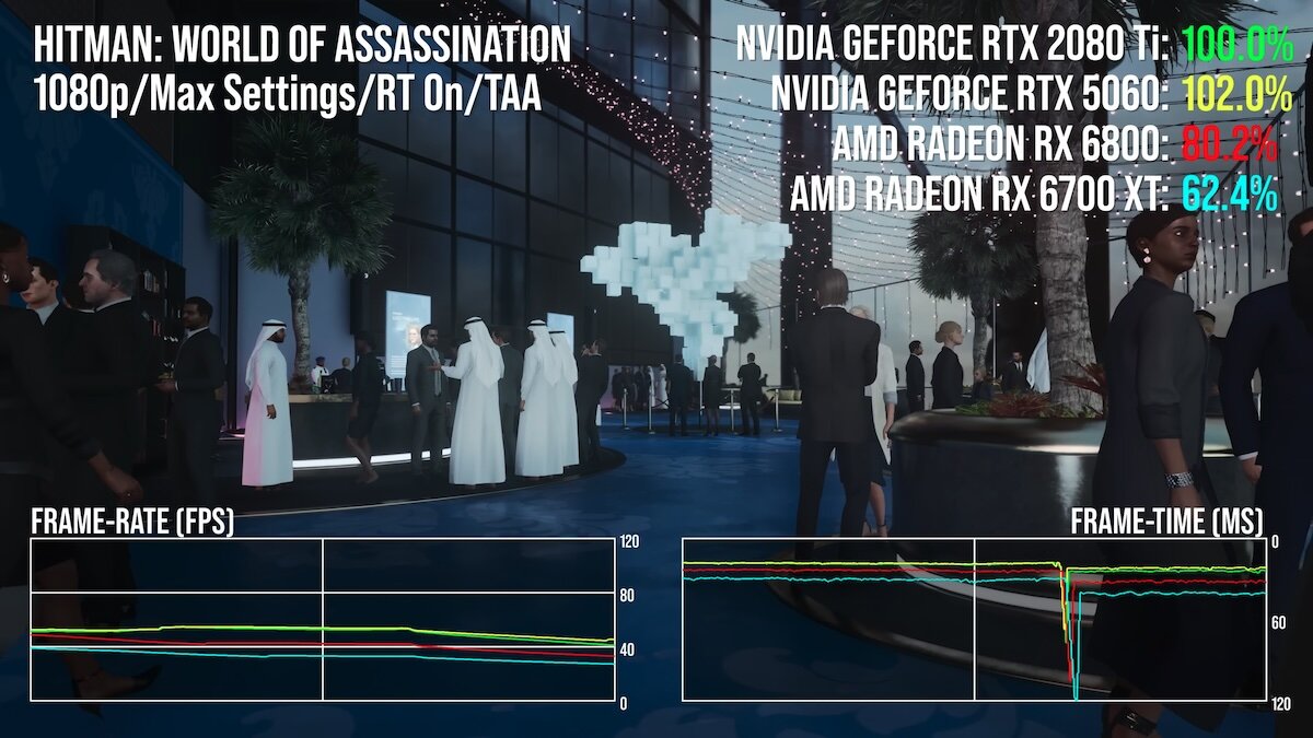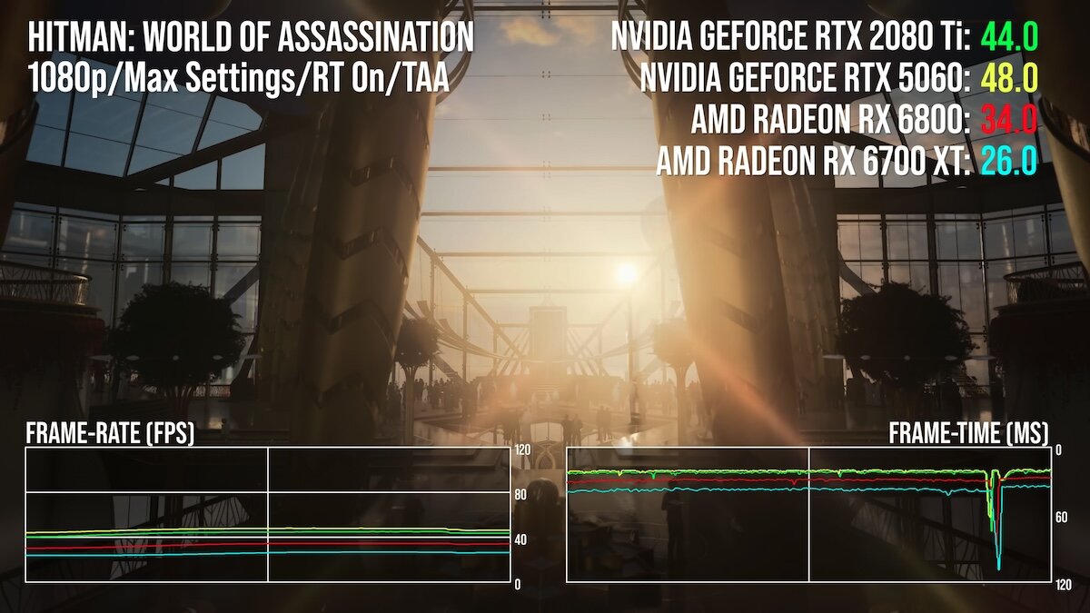 Но самое интересное, что даже в самых новых ААА-играх, которые применяют передовые технологии NVIDIA, предоставляя серии RTX 50 ряд преимуществ, существенного отрыва RTX 5060 всё равно не демонстрирует. К примеру, в свежей Alan Wake 2 свежая карта обогнала семилетнюю видеокарту всего на 12% — эту разницу в частоте кадров без специальных замеров заметить будет весьма проблематично. В остальных же играх модели работают буквально ноздря в ноздрю — в Hitman World of Assassination, Cyberpunk 2077 или Black Myth: Wukong видеокарты либо показывают идентичный результат, либо одна из моделей обгоняет другую на 2-4 FPS в лучшем случае.