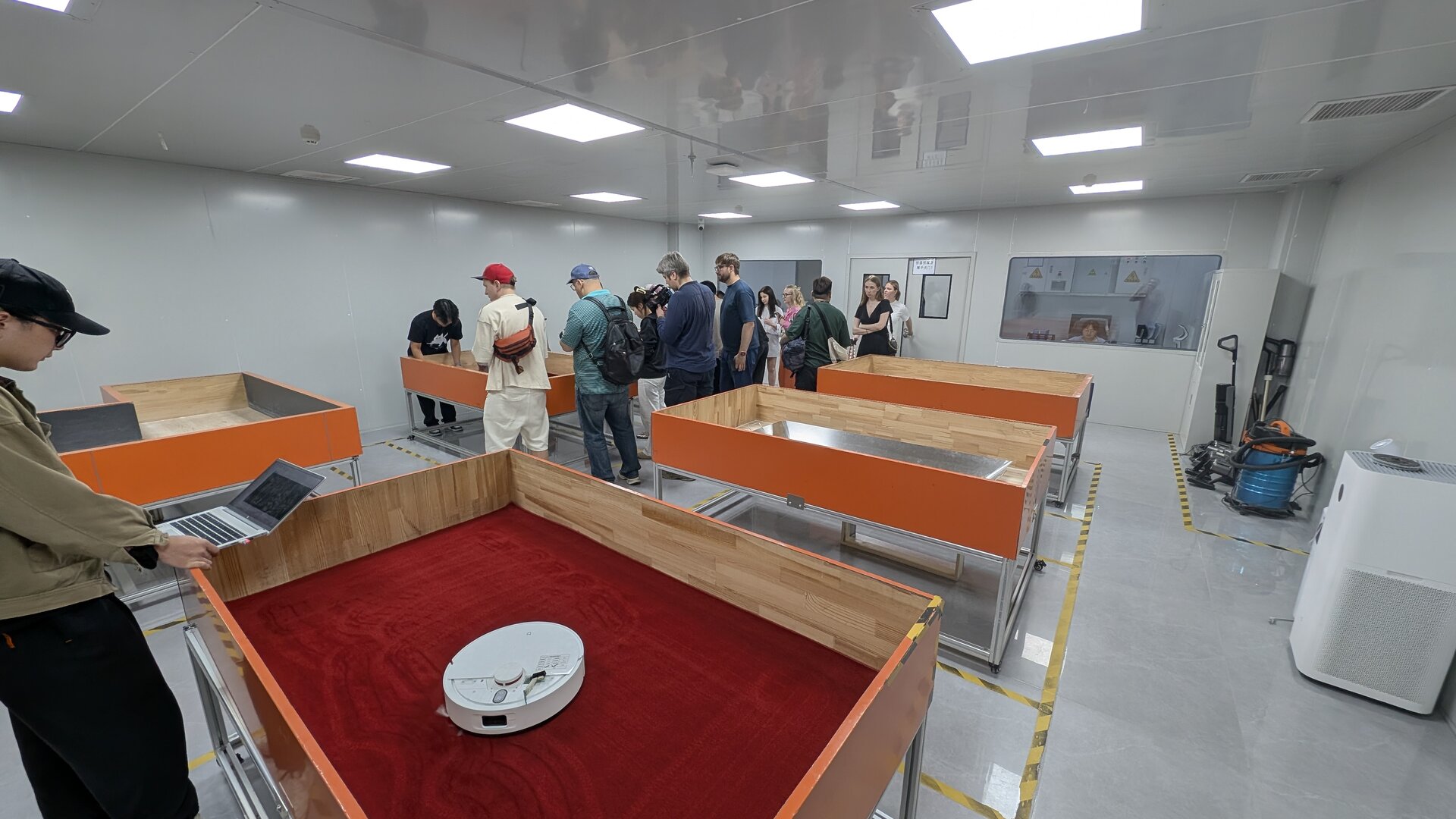 Были замечены на предприятии и роботы-гуманоиды — они, например, помогают в автоматическом режиме тестировать срок службы моющих пылесосов (по одному в каждую роботизированную руку). Или, например, в лаборатории изучают возможности пылесосов в мойке полов — для этого здесь представлены различные ковровые покрытия на специальных площадках.