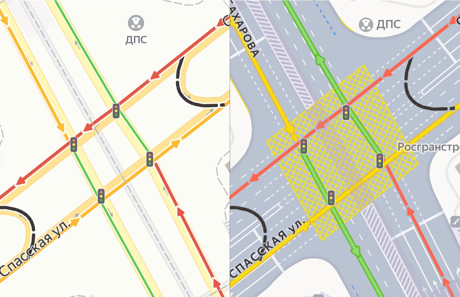 Цветовую схему пробок не меняли настолько же кардинально, но её сделали более насыщенной и контрастной для лучшей видимости, переработав под новый вид дорог. Этого достигли и благодаря адаптивной толщине линий обозначения пробок, которые теперь зависят от класса дорог — например, на крупных магистралях полоски толще, чем на обычных улицах.