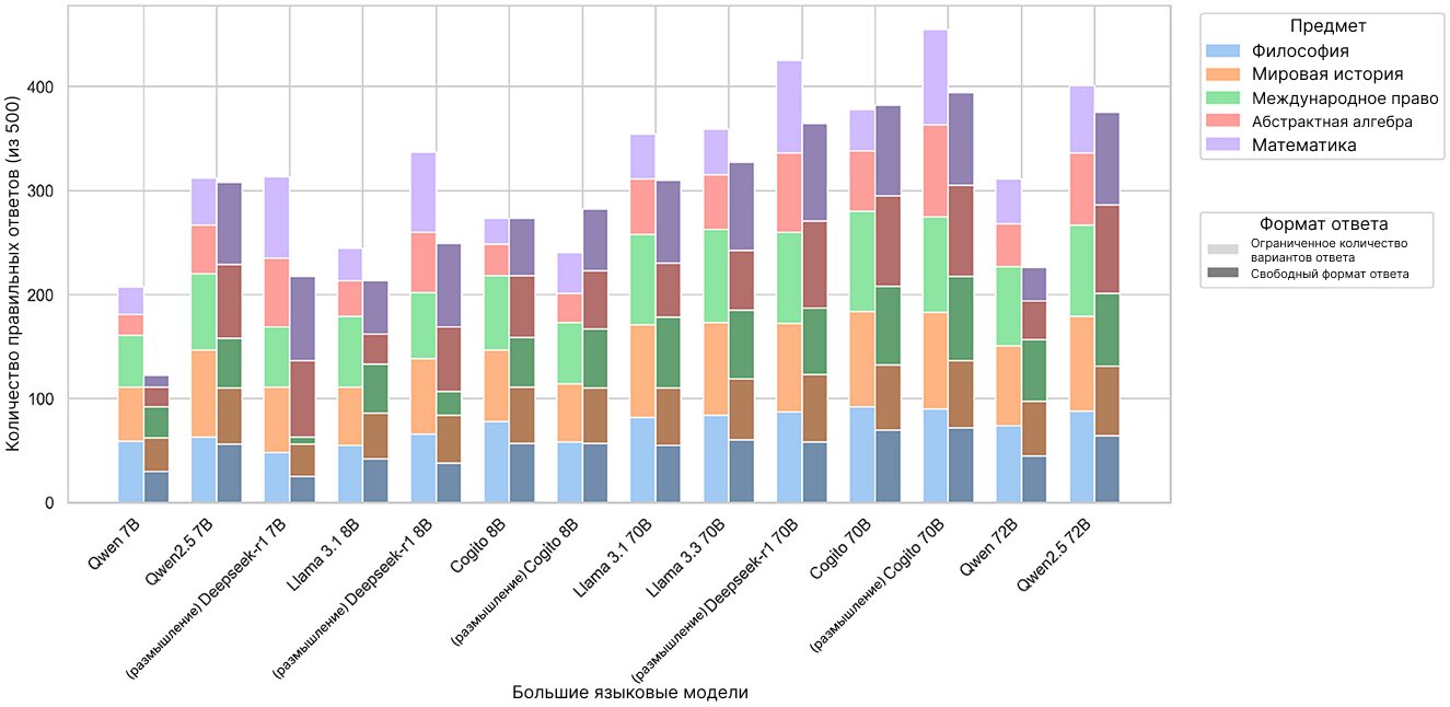 Если же рассматривать результаты по отдельным предметам, то в режиме ограниченного набора вариантов лучший результат модели показывают по школьному курсу всемирной истории — в среднем 76,3% правильных ответов на модель. А худший — по абстрактной алгебре, где средний процент правильных ответов составляет 51,4%. В режиме свободного ответа наилучшие результаты были достигнуты по школьной математике (69,4%), а худшие — по философии (52,1%).