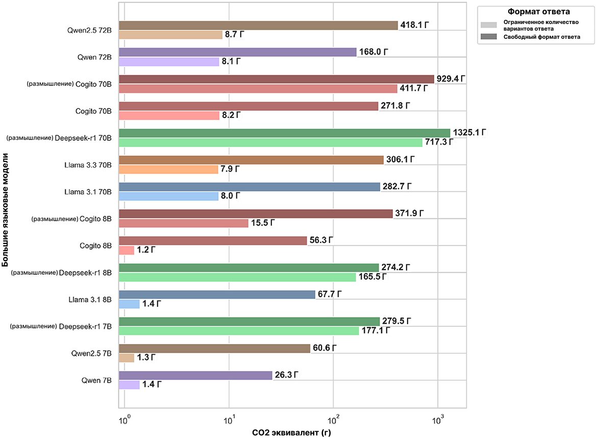 В фазе с выбором из ограниченного количества ответов выбросы варьировались от всего 1,25 грамма CO2 для модели Cogito 8B до 717,31 грамма CO2 для модели Deepseek-R1 70B. Варианты больших языковых моделей с поддержкой рассуждений генерировали значительно больше выбросов, чем их стандартные аналоги (например, Cogito 70B с рассуждением выделяет 411,72 грамма, тогда как Cogito 70B по умолчанию выделяет всего 8,2 грамма), при этом крупные модели (70-72B) стабильно выделяют от 100 до 700 граммов, тогда как компактные модели (7-8B) в среднем генерировали менее 180 граммов.