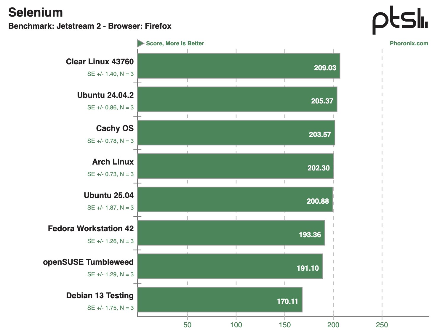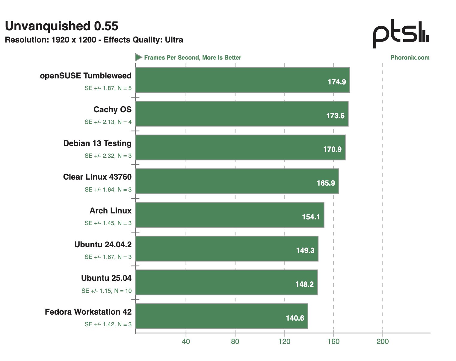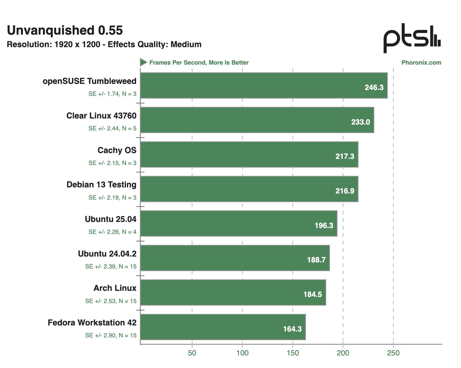 Если внимательно посмотреть на результаты тестов, связанных с 3D-графикой, то можно отметить, что openSUSE Tumbleweed, CachyOS и Clear Linux 43760 довольно часто занимают лидерские позиции по баллам, хотя отрыв зачастую не очень значительный. Также себя очень хорошо зарекомендовали Fedora Workstation 42 и Arch Linux, а вот Ubuntu 25.04 зачастую занимает последнее место в рейтинге.