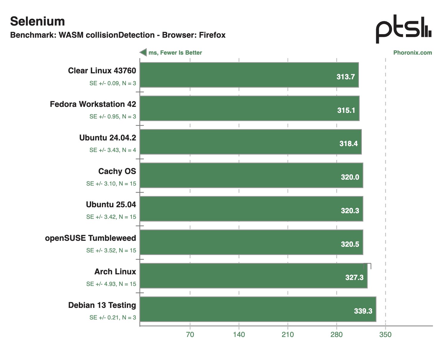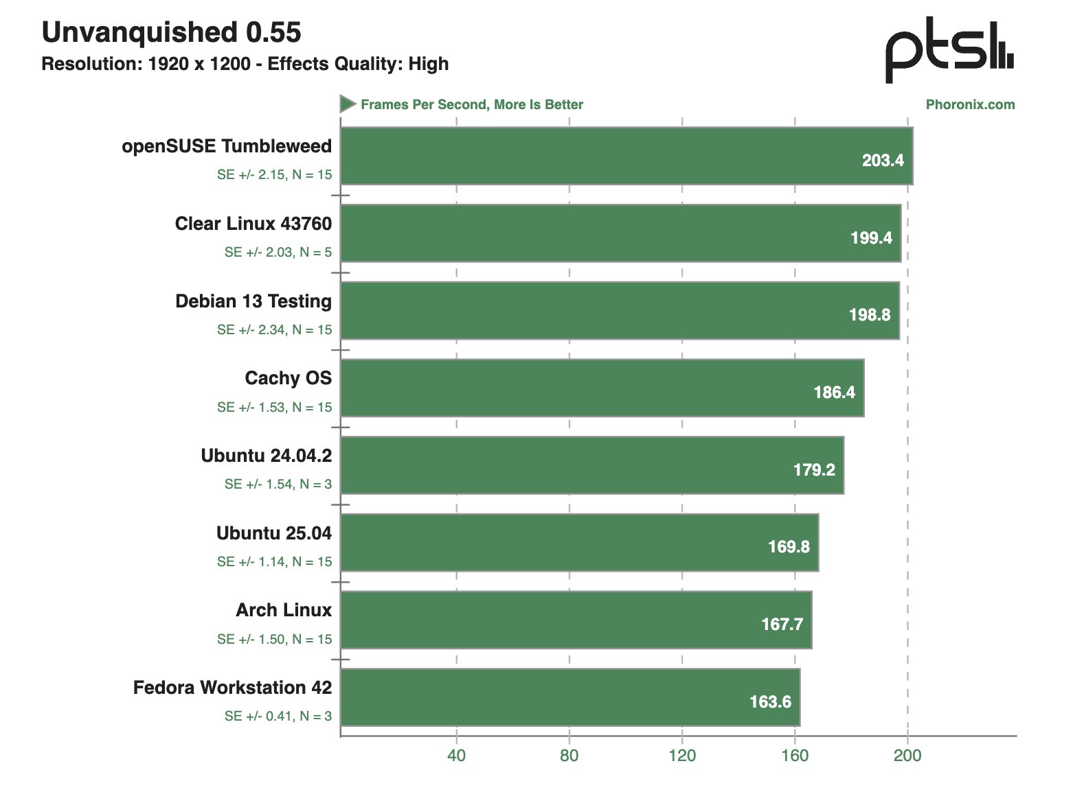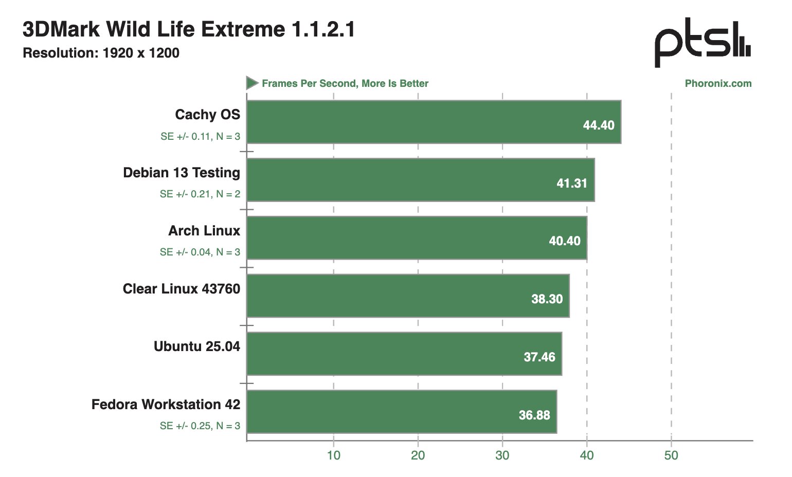Если внимательно посмотреть на результаты тестов, связанных с 3D-графикой, то можно отметить, что openSUSE Tumbleweed, CachyOS и Clear Linux 43760 довольно часто занимают лидерские позиции по баллам, хотя отрыв зачастую не очень значительный. Также себя очень хорошо зарекомендовали Fedora Workstation 42 и Arch Linux, а вот Ubuntu 25.04 зачастую занимает последнее место в рейтинге.