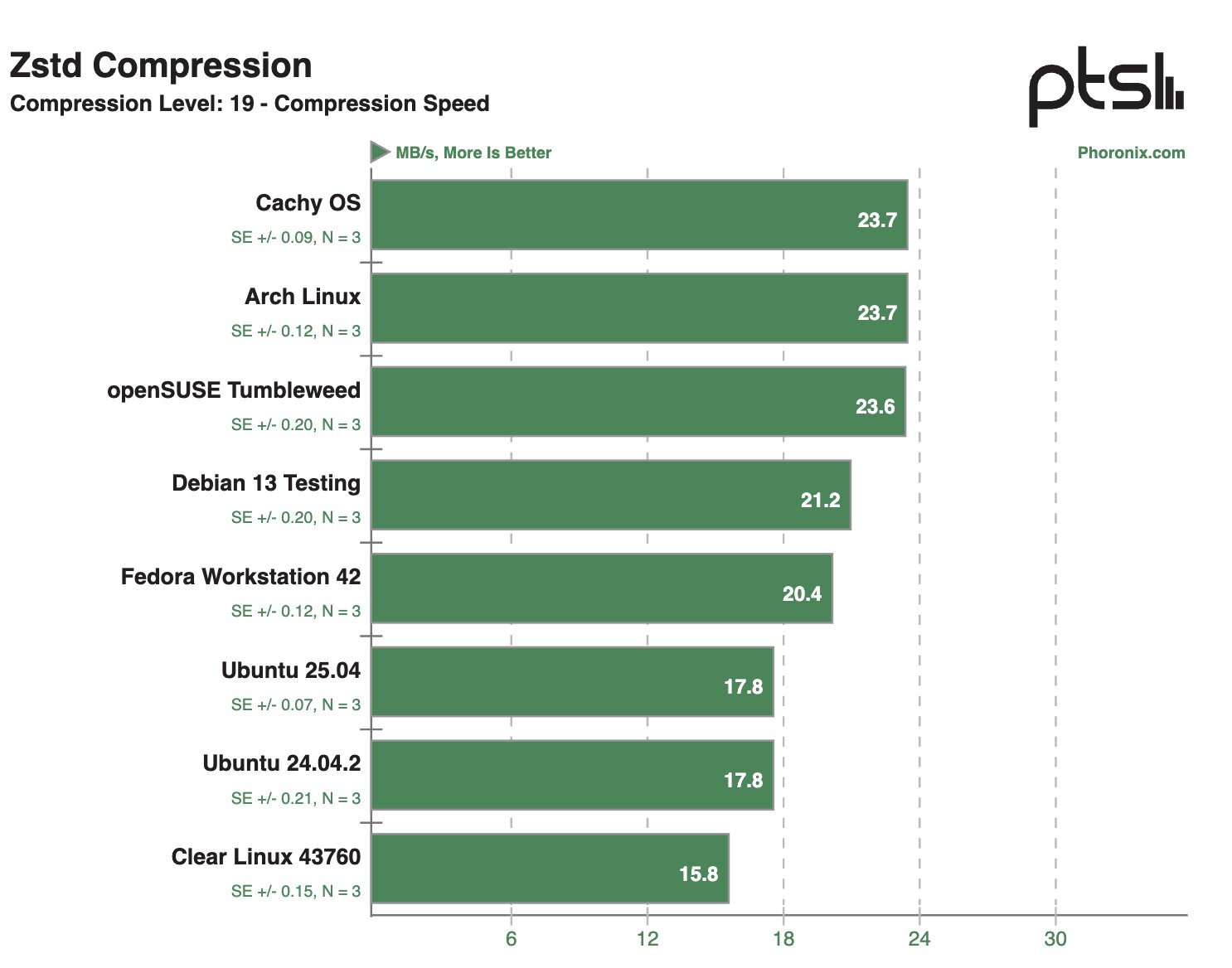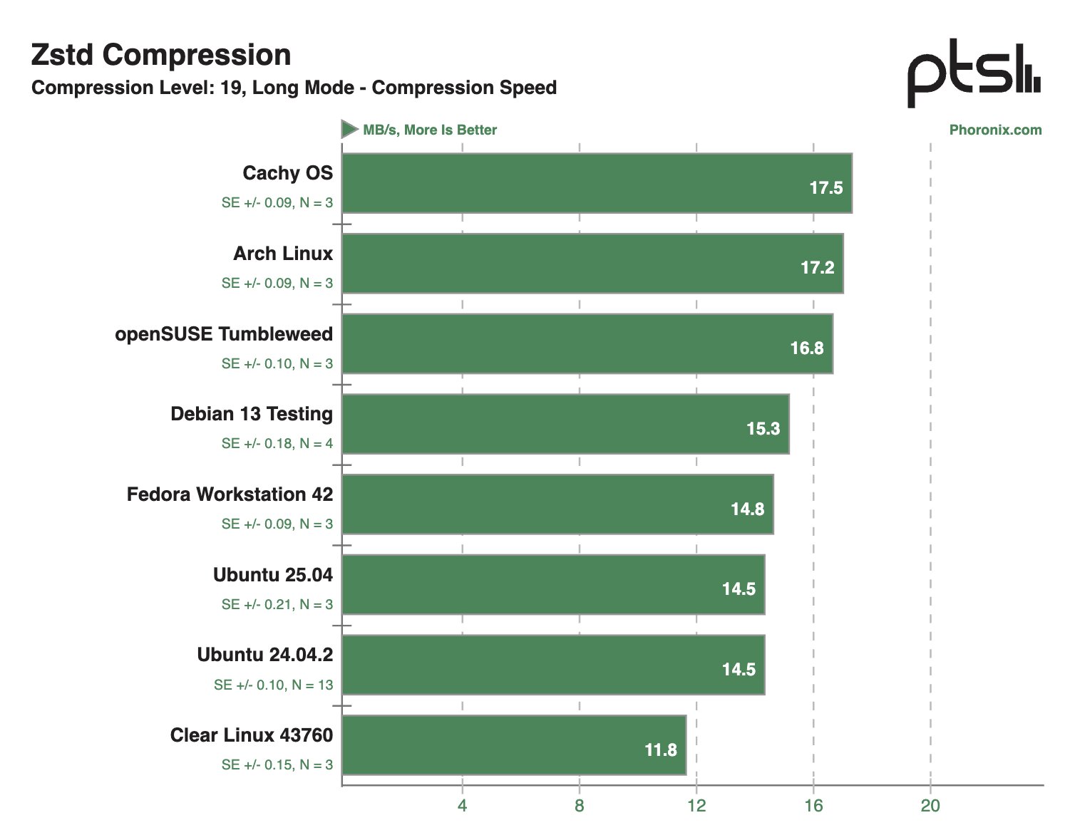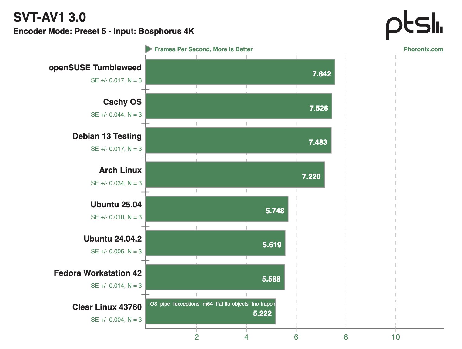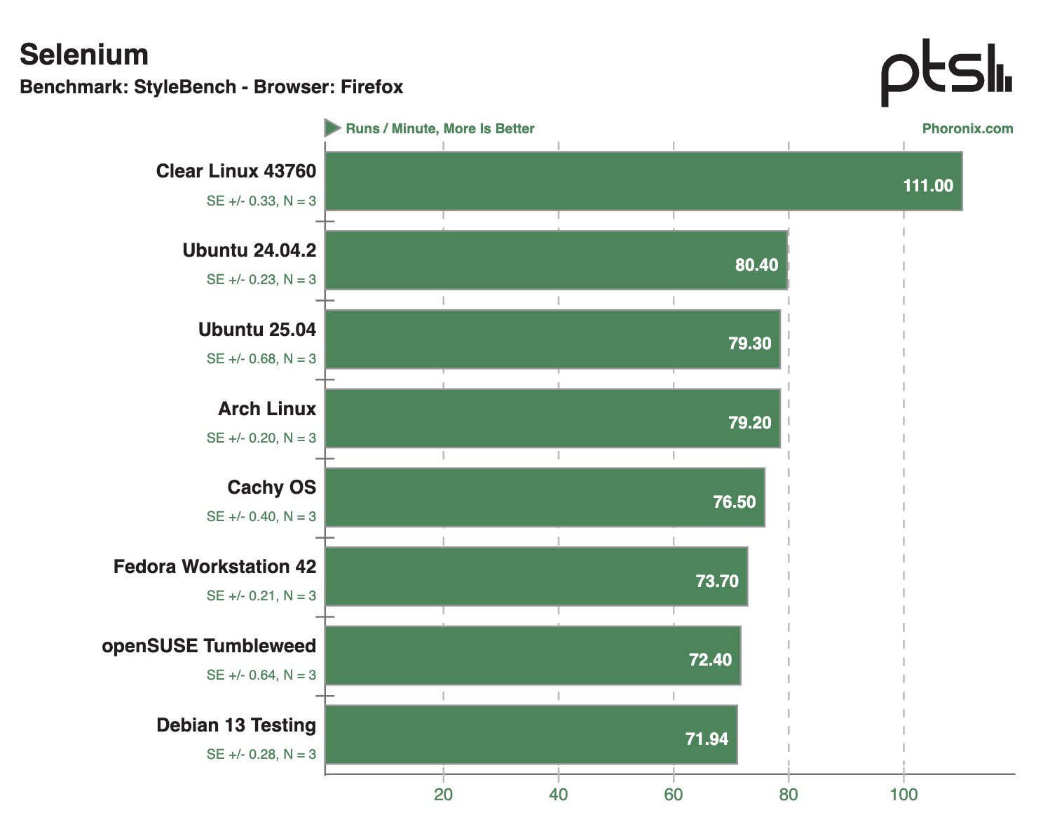 После проведения десятков тестов на ноутбуке Framework 12 наибольшую производительность в бенчмарках продемонстрировала система на базе Clear Linux — в 28,1% тестов этот дистрибутив занял первое место в рейтинге. На втором месте расположилась CachyOS — в 22,8% сценариев этот дистрибутив занимал пьедестал.