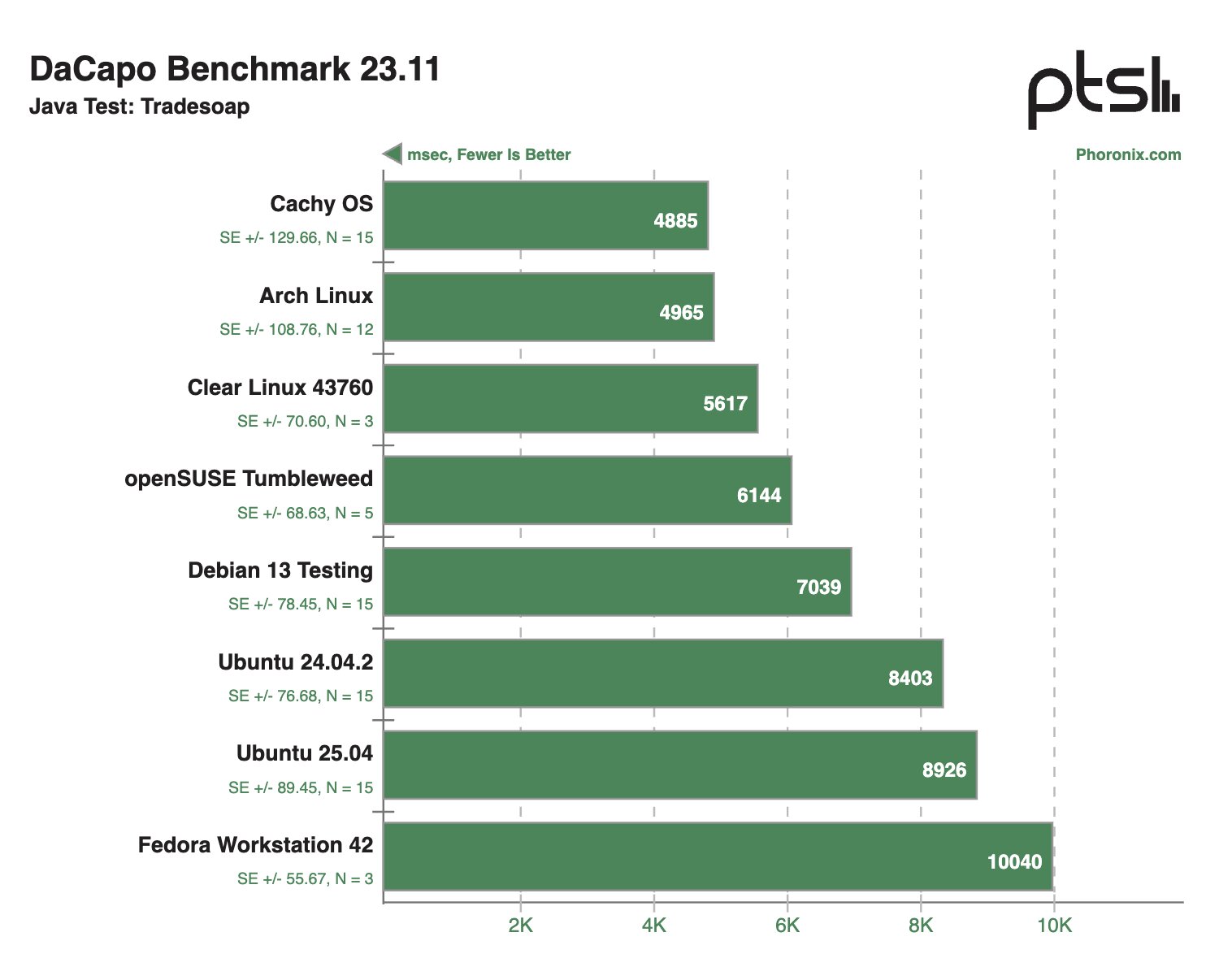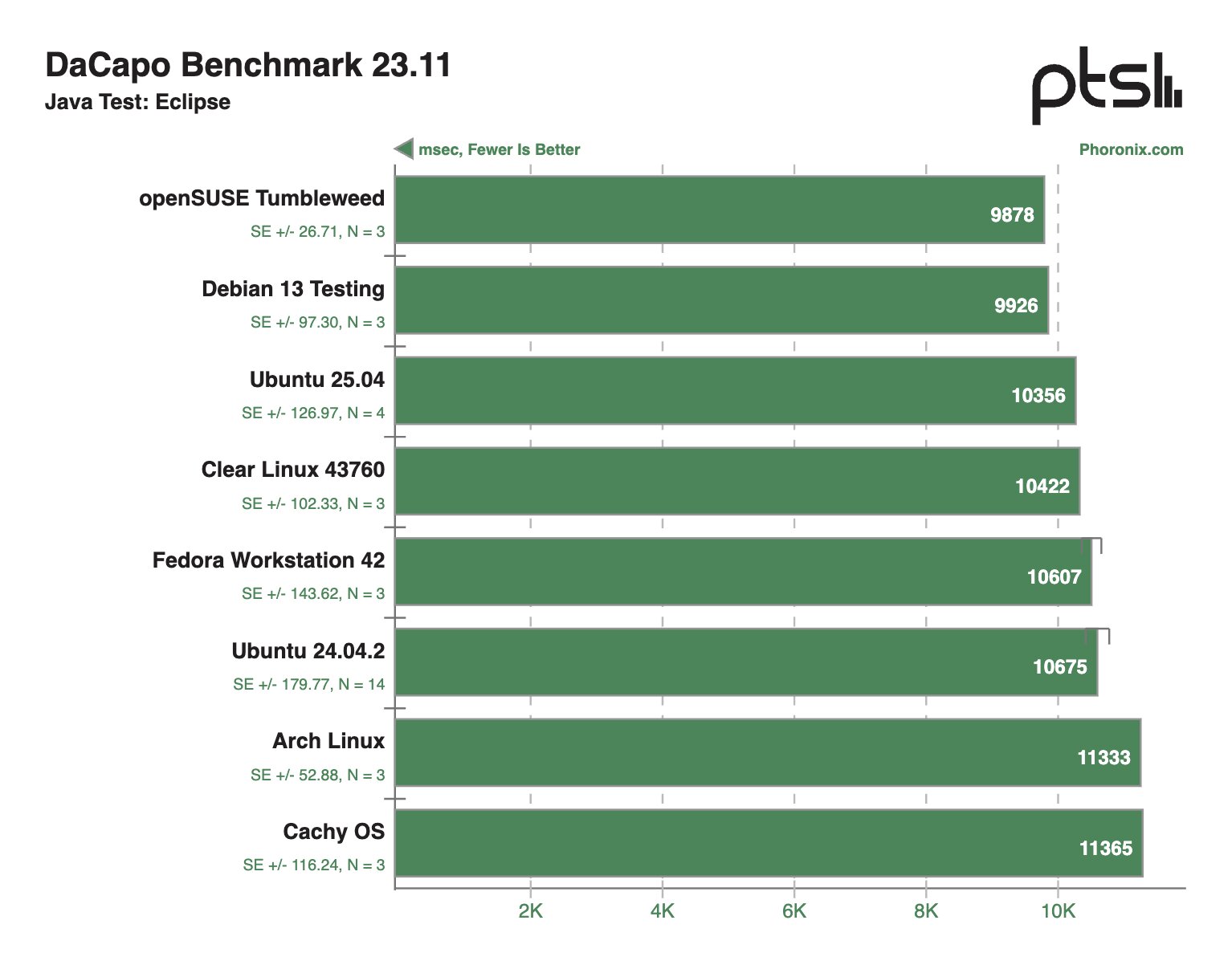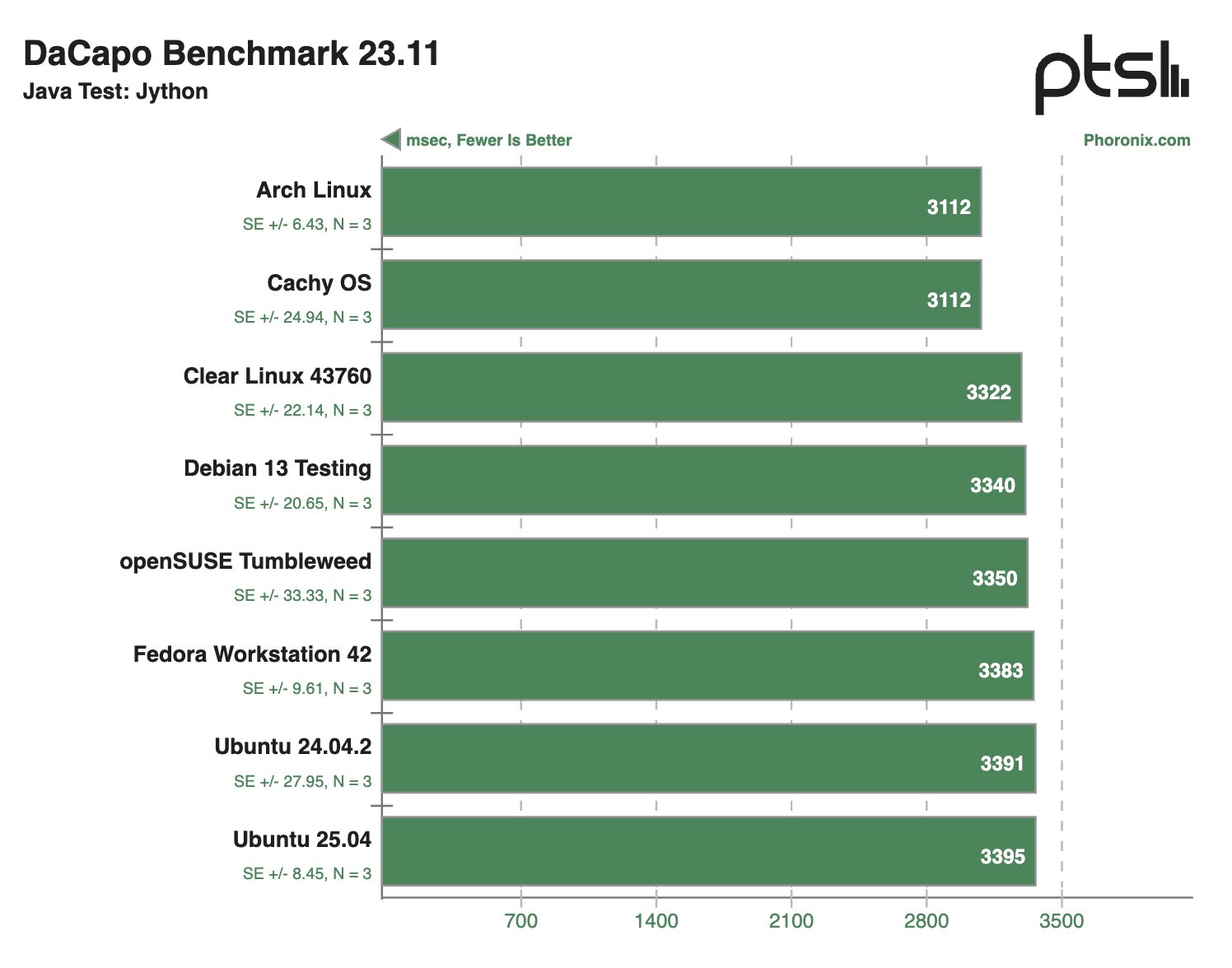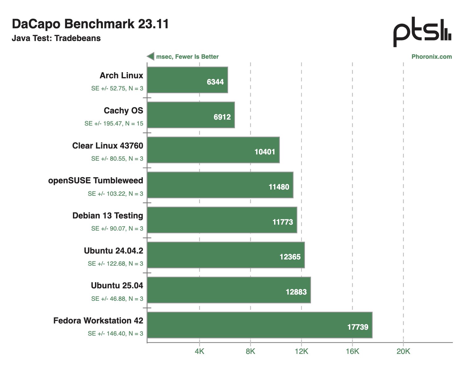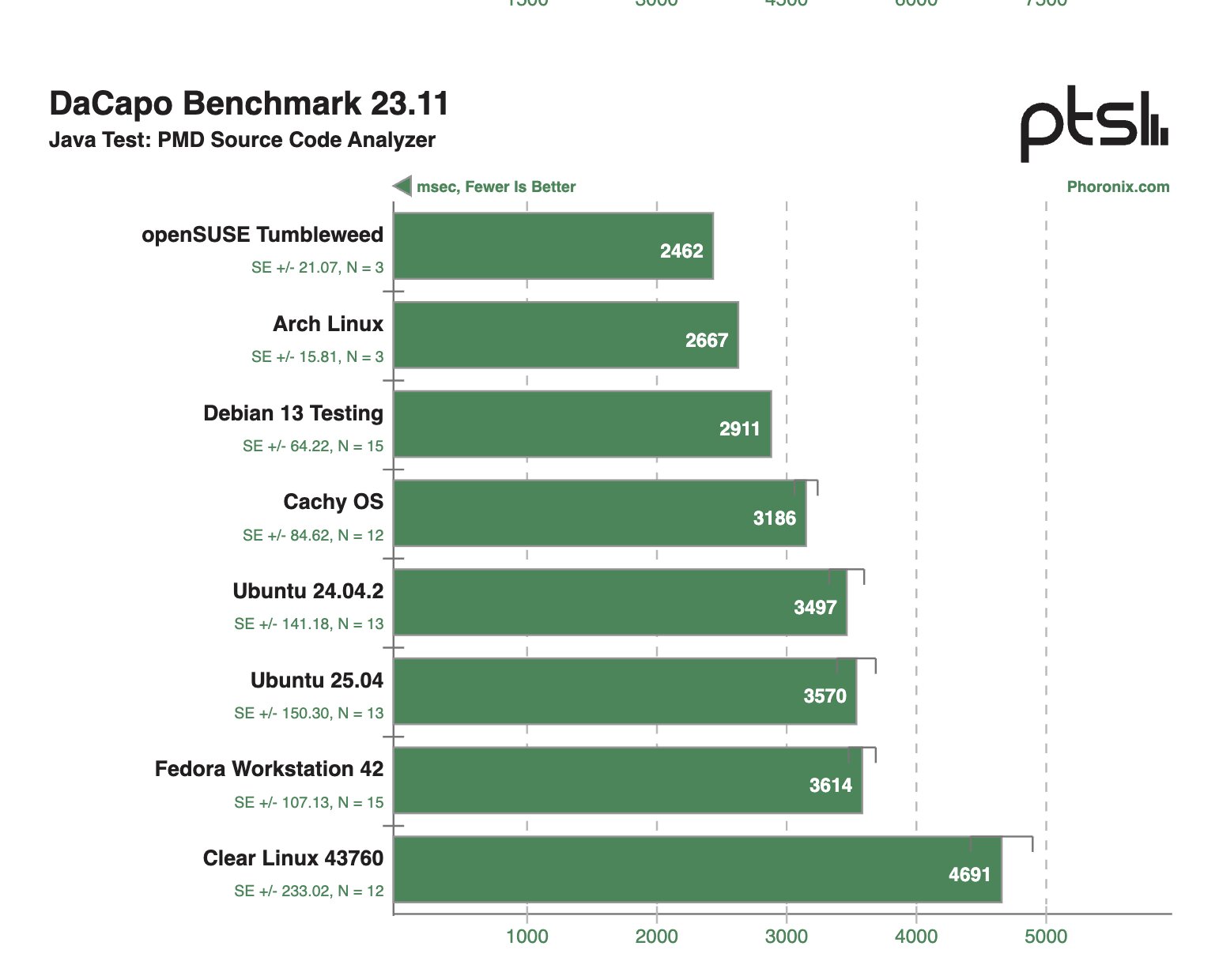 В Java-тестах ситуация очень похожая, хотя безоговорочного лидера выделить, безусловно, не удалось, плюс Arch Linux периодически демонстрировал более привлекательные результаты, чем CachyOS, Clear Linux 43760 и openSUSE Tumbleweed.