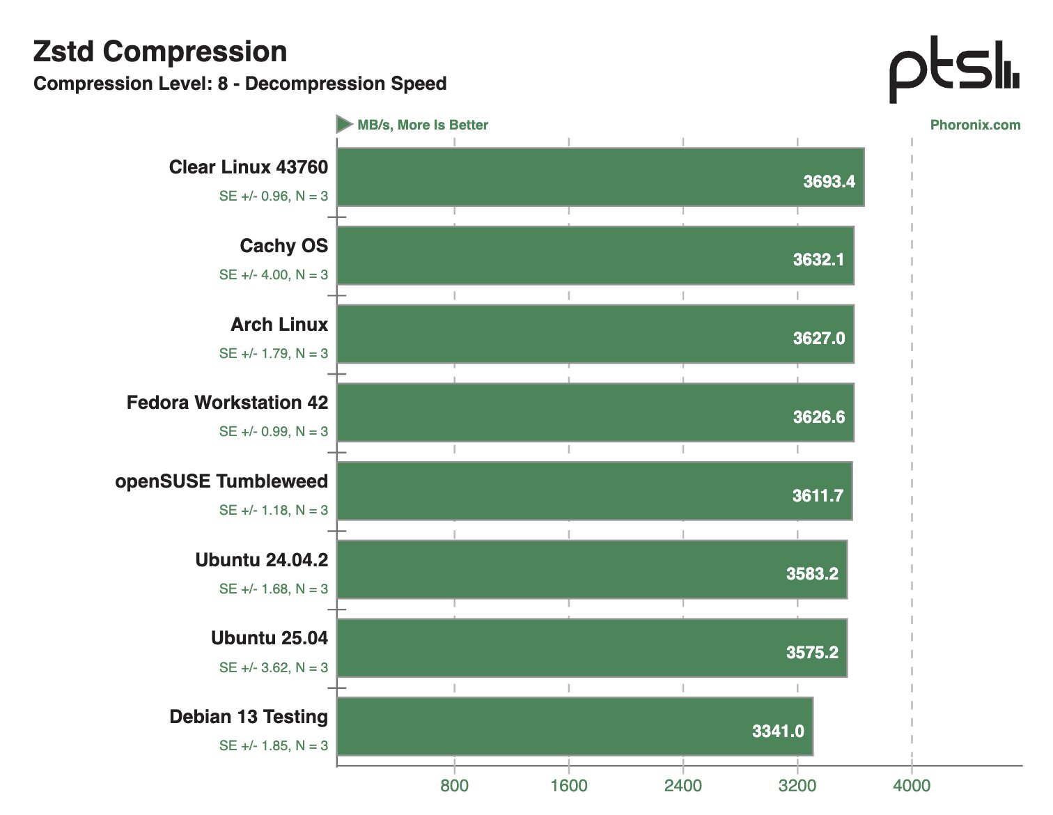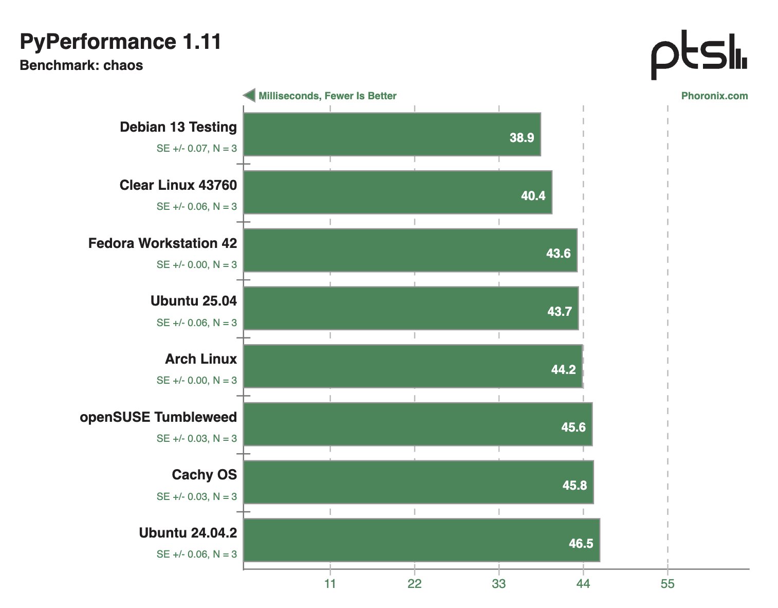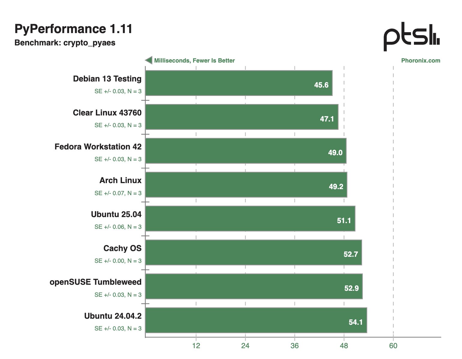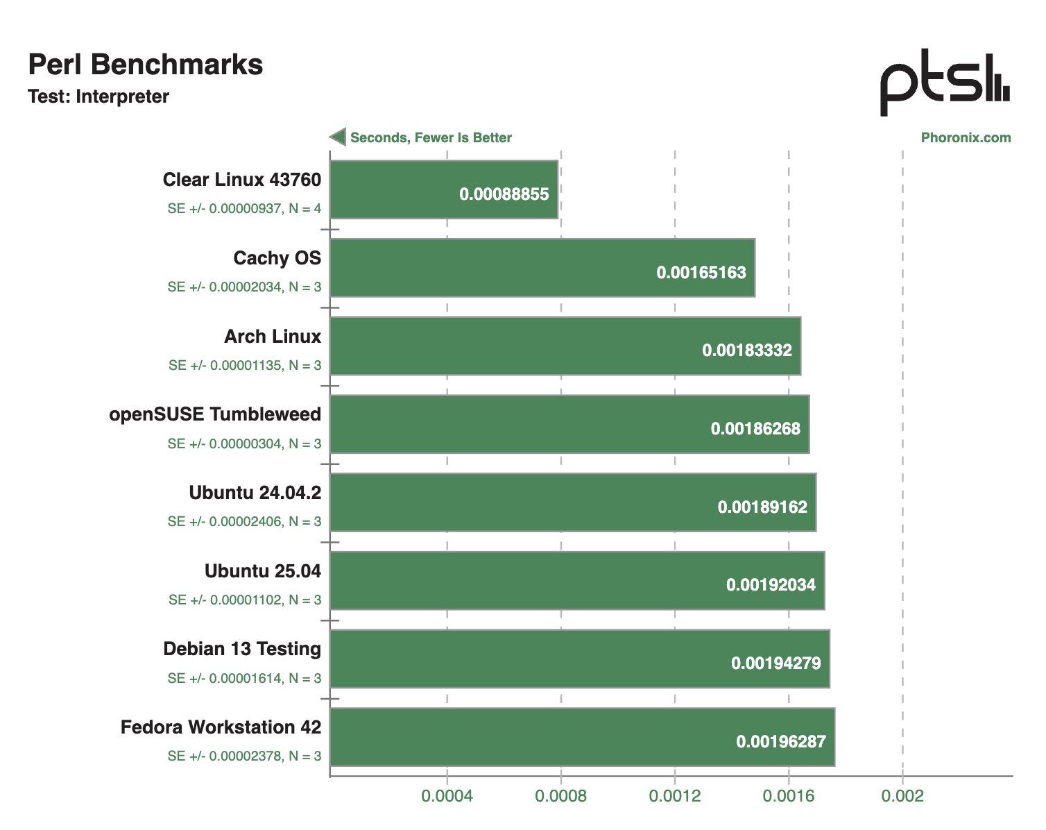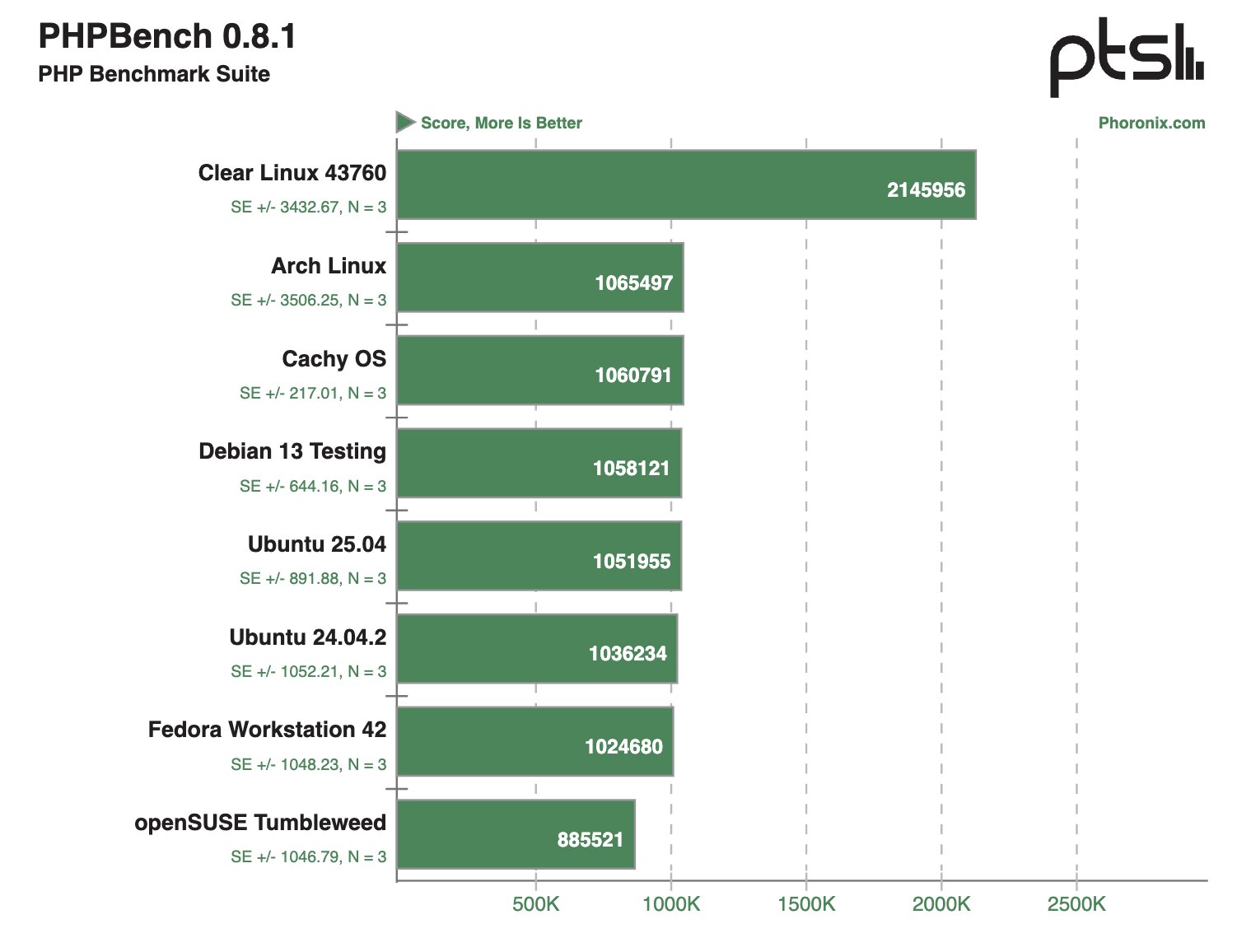 В других синтетических тестах Clear Linux и Debian 13 Testing тоже демонстрировали внушительные результаты, моментами опережая конкурентов в два раза.