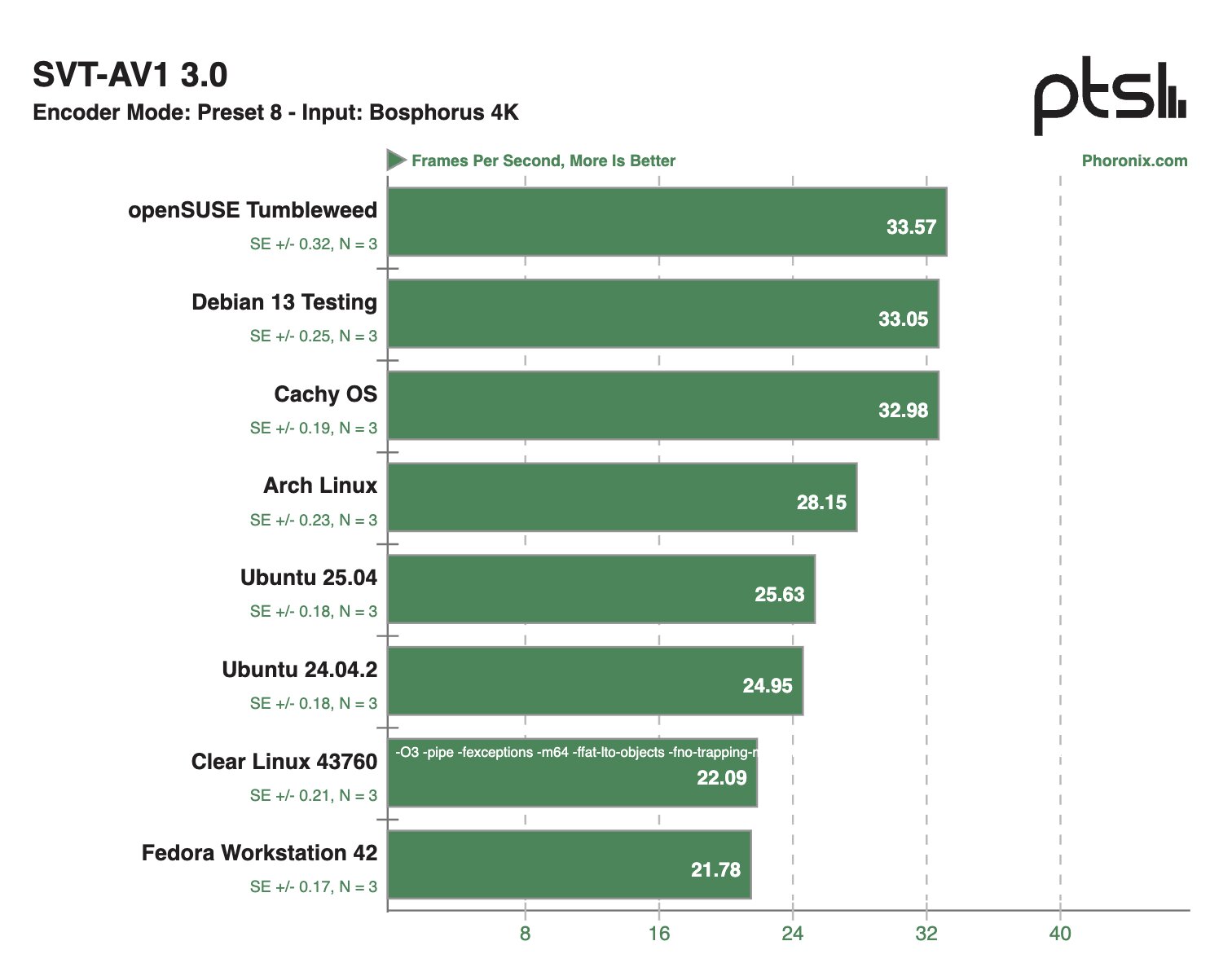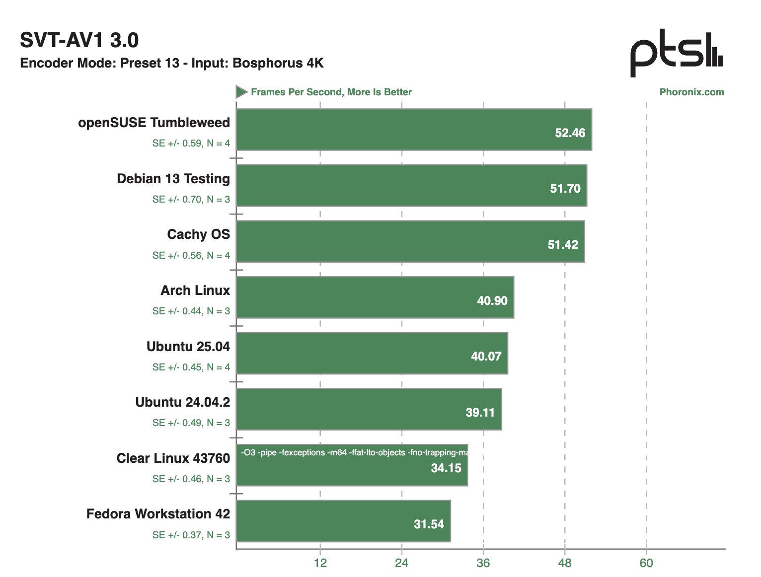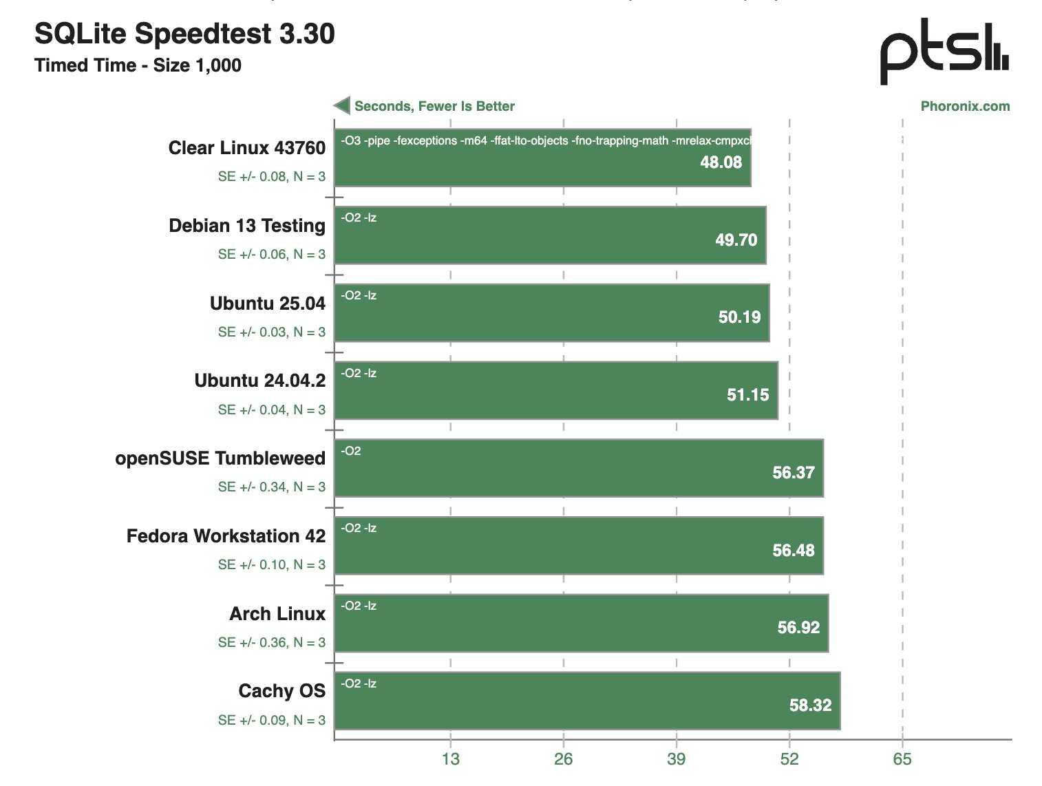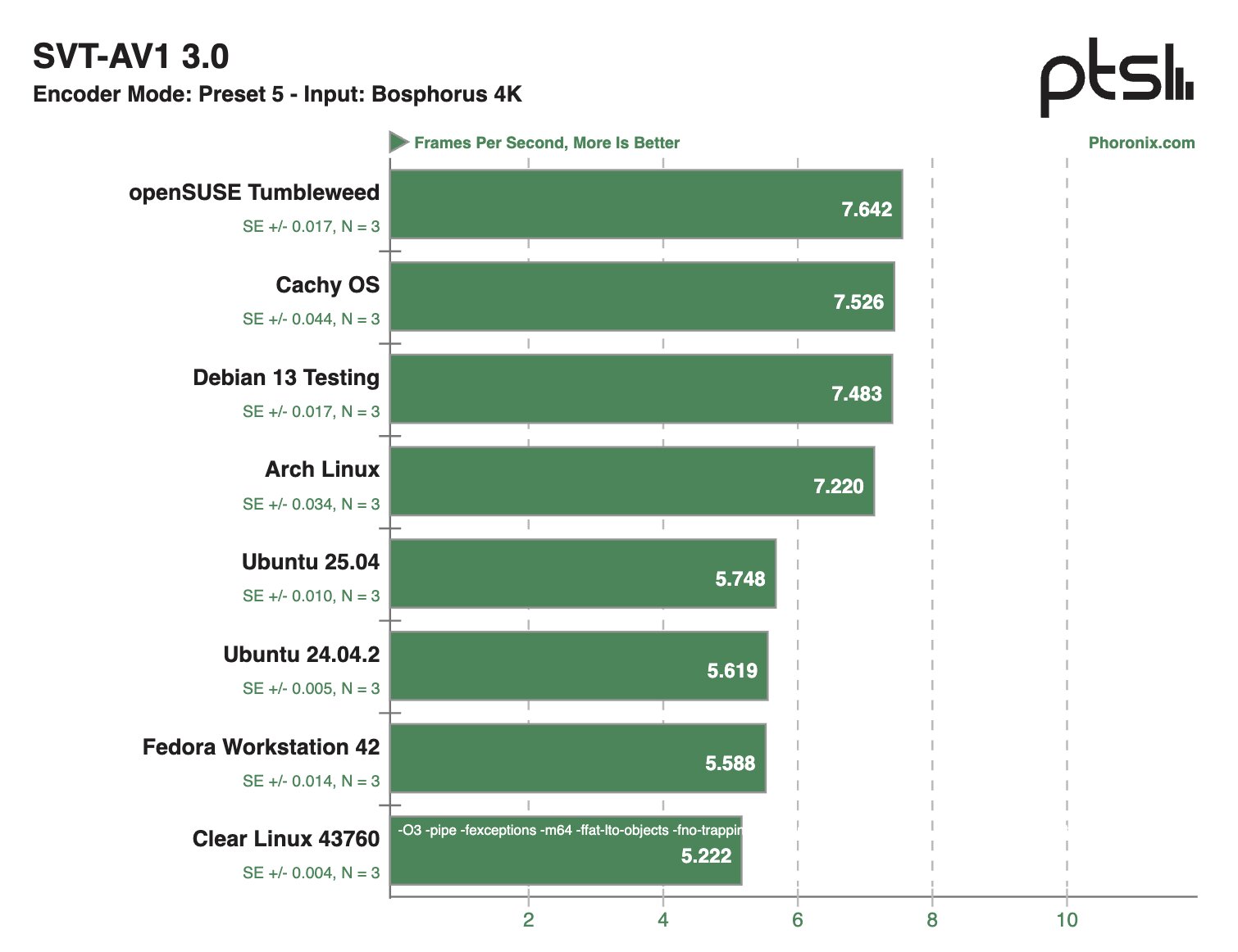 В сценариях с кодированием видео на базе центрального процессора наилучшую производительность продемонстрировали дистрибутивы Debian 13 Testing, CachyOS, Arch Linux и openSUSE Tumbleweed. При этом в области работы со встроенной библиотекой баз данных SQLite, которая часто используется в различных приложениях, лидеров оказалась система на Clear Linux.