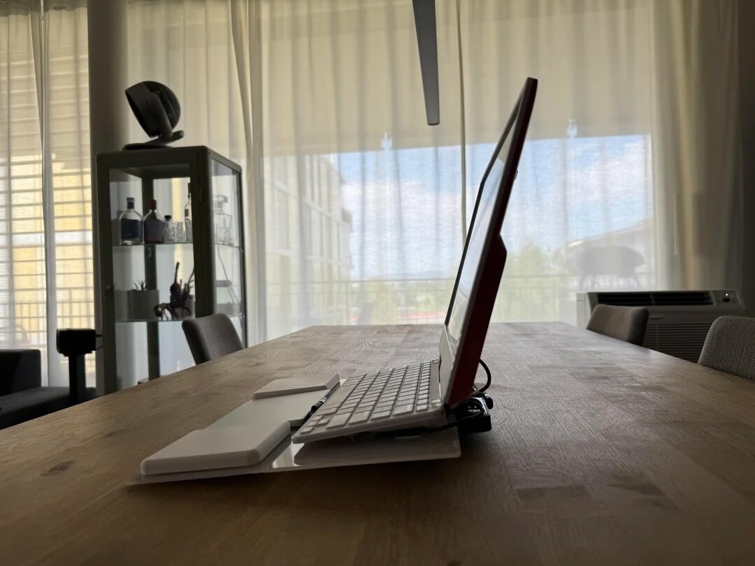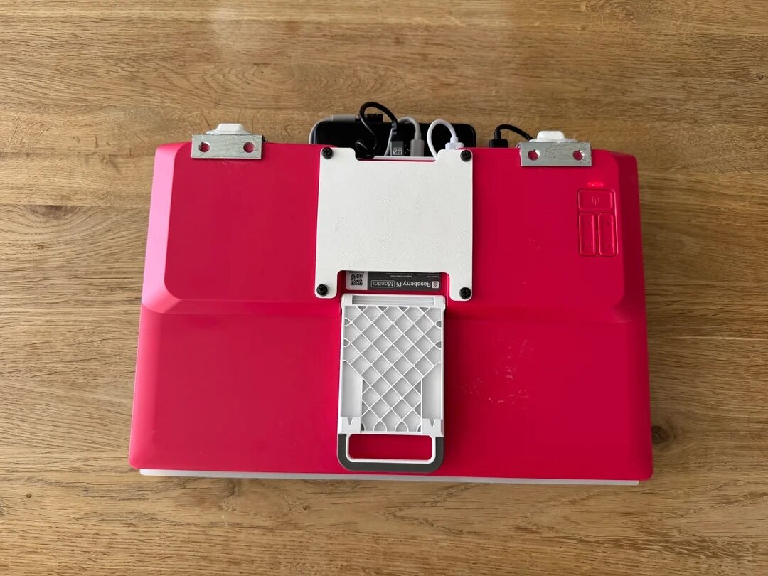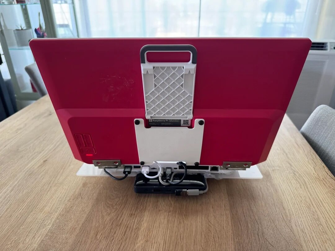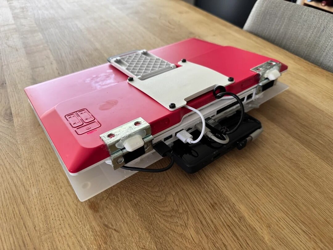 Инженер подключил к Raspberry Pi 500 официальный монитор (по USB), добавил сенсорную панель (тоже подключена по USB) и небольшой тонкий повербанк. Для того, чтобы всё это собрать воедино, он смоделировал, а затем напечатал на 3D-принтере корпус (половинки «ноутбука» закреплены довольно грубо, да ещё и при помощи клея, что сильно портит визуал портативного ПК). Правда, пользоваться монитором на яркости выше 30% автор идеи не может — появляется заметное мерцание.