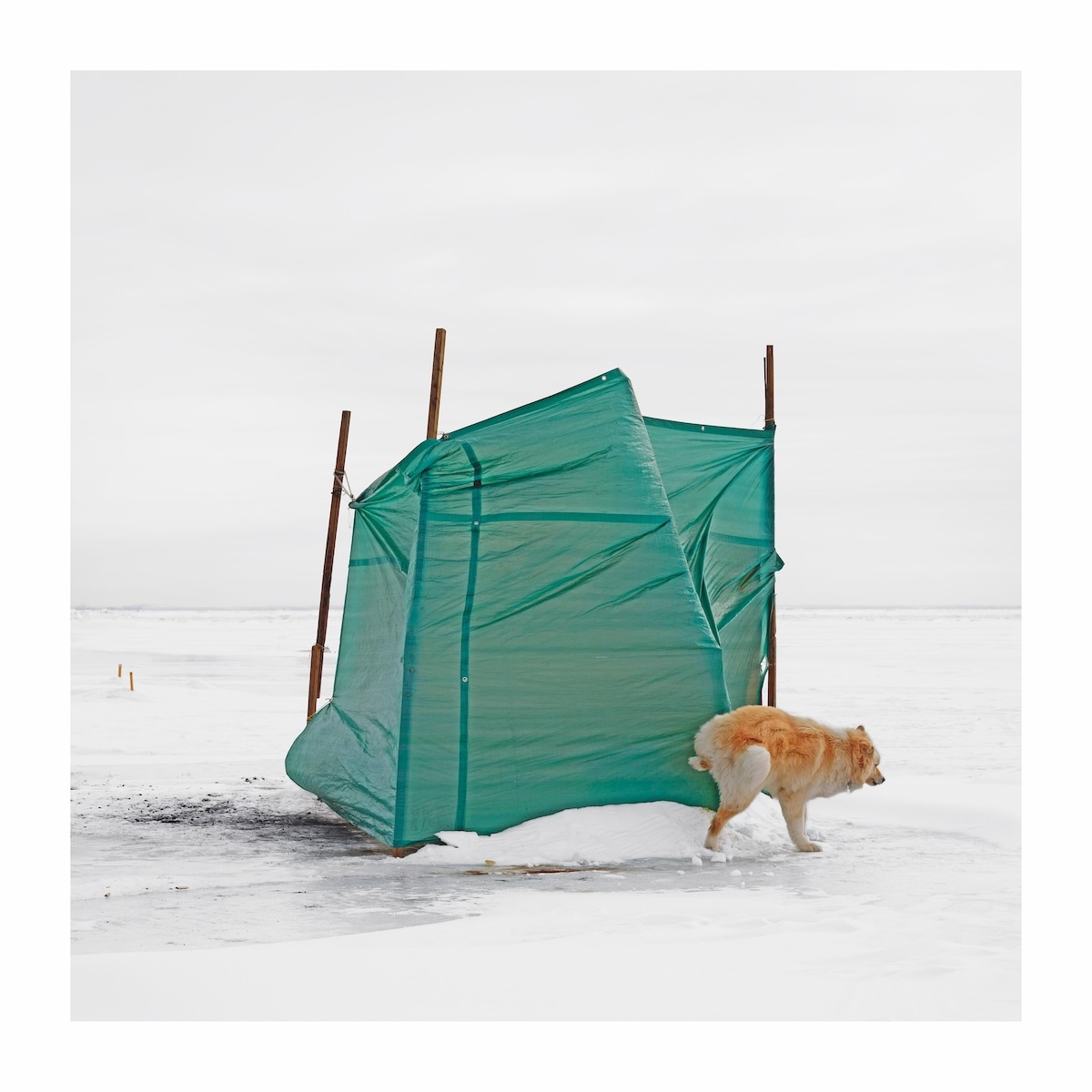 Notably absent from Johnson’s photographs are people. Just as vernacular architecture is often understood as ‘architecture without architects’, Johnson’s images reflect the idiosyncrasies of each hut owner, but with owners rarely visible. Smoke occasionally curls from a chimney and footprints or tire tracks imprint the surrounding snow, but the huts otherwise stand alone, quietly implying human presence without announcing it. They are portraits by proxy.