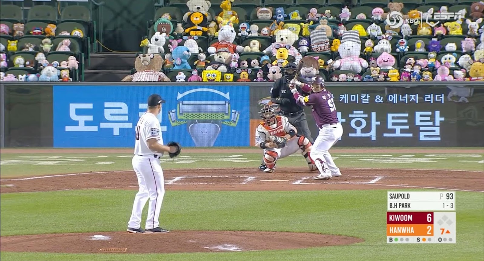 En un encuentro entre los Héroes de Kiwon y las Águilas de Hanwha, una multitud de pokemones y peluches tomaron el parque, desde el desfile de enormes Pikachus hasta la presencia de coloridos espectadores de felpa.