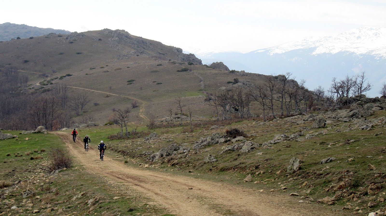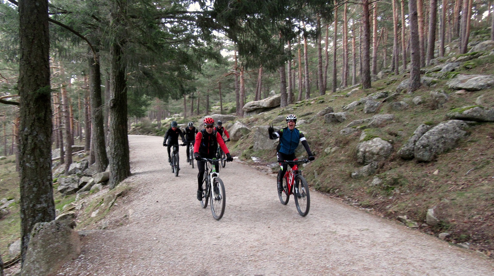 Estamos en el punto más bajo de la ruta al alcanzar la M-629, pero rápido la abandonamos para coger de nuevo pista forestal que en los primeros 3 kilómetros ya nos será conocida, pero sólo hasta alcanzar encrucijada de tres caminos. Ángel marcha delante de mí a buen ritmo y pienso que ha tomado el camino correcto. Yo hago amago de entrada a las tres opciones para estar seguro de que no interpreto mal el GPS y cuando llegan Enrique y Ernesto les indico: Por la derecha.