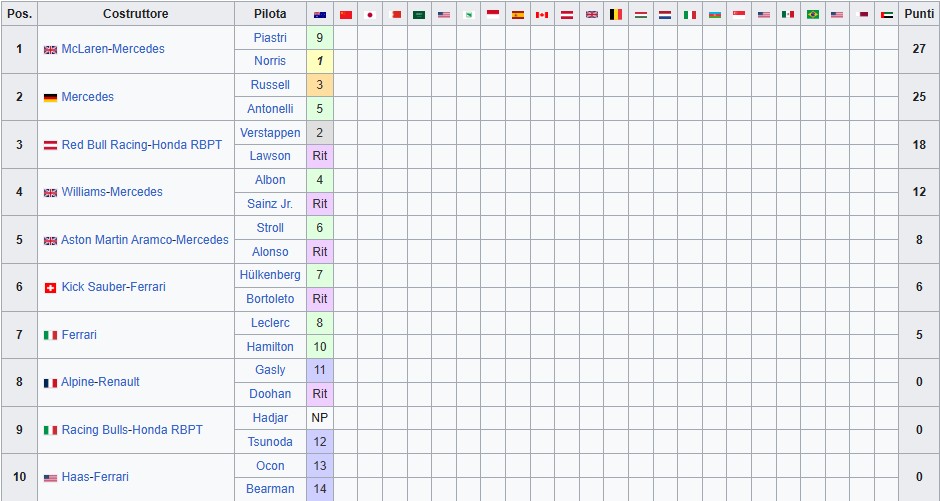 1 McLaren 27 2 Mercedes 25 3 Red Bull 18 4 Williams 12 5 Aston Martin 8 6 Kick Sauber 6 7 Ferrari 5 8 Alpine 0 9 Haas 0 10 RB 0