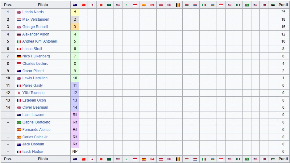 1 L. Norris McLaren 25 2 M. Verstappen Red Bull 18 3 G. Russell Mercedes 15 4 A. Albon Williams 12 5 K. Antonelli Mercedes 10 6 L. Stroll Aston Martin 8 7 N. Hulkenberg Sauber 6 8 C. Leclerc Ferrari 4 9 O. Piastri McLaren 2 10 L. Hamilton Ferrari 1 11 C. Sainz Williams 0 12 L. Lawson Red Bull 0 13 F. Alonso Aston Martin 0 14 P. Gasly Alpine 0 15 Y. Tsunoda RB 0 16 E. Ocon Haas 0 17 O. Bearman Haas 0 18 I. Hadjar RB 0 19 G. Bortoleto Sauber 0 20 J. Doohan Alpine 0