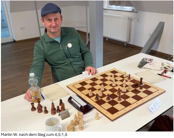 Nachdem sich bereits über die ersten 90 Minuten ein durchweg positives Stellungsbild an allen Brettern abzeichnete, konnte der MF um die Mittagszeit entspannt das erste Remisangebot an Peter „freigeben“ – auch weil er selbst kurz danach den ersten vollen Punkt beitragen konnte, da sein Gegner erfreulicherweise bereits gegen 11:00 im 10. Zug beschloss, einen Springer gegen einen Bauern + Schach zu opfern, was aber keineswegs zu Matt oder mittelfristigem Vorteil sondern zum 1,5:0,5 für uns führte, da der MF diesen unverhofften Materialvorteil konsequent ausbaute. Vielleicht trug dann der mittägliche Hunger zu einer ganzen Serie von Remisangeboten bei, wobei zwei davon von M. Wißler und W. Scherer abgelehnt wurden, J.Diehl annahm und der zwar materialgleich aber sehr gedrückt stehende T. Becherer seinerseits mit Remis zufrieden war, nachdem der Gegner sich sein zuvor starkes Läuferpaar selbst mit einer 8-Bauernkette blockiert hatte. Um 12:30 Uhr stand es so 2,5:1,5 plus einem sehenswerten Mattangriff von Erwin mit zwei Türmen + Dame, der dann gegen 13:00 Uhr zum 3,5:1,5 führte. Die drei noch laufenden Partien sahen „mindestens remis“ aus. Es sollte aber dann noch ca. 1,5 Stunden dauern, bevor M. Wißler (siehe Bild) mit seinem Sieg den inzwischen absehbaren Mannschaftssieg sichern konnte.