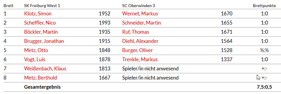 Die Dritte Mannschaft trat mit nur sechs Mann als krasser Außenseiter bei Freiburg West an. Die Frage war, ob einer der sechs wackeren Recken eine Überraschung schaffen würde und etwas Zählbares holen konnte? Tatsächlich gelang dies mit einer guten Leistung O. Burger, der ein Remis gegen den über 300 DWZ-stärkeren Gegner erzielen konnte! Die restlichen Partien gingen trotz Gegenwehr leider verloren, so dass der Mannschaftkampf deutlich mit 7,5:0,5 an die Freiburger ging.
