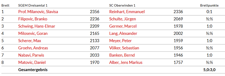 Die erste Mannschaft unterlag erneut gegen Dreisamtal, wie dies auch bereits die Jahre zuvor der Fall war. Zunächst gab es drei Schwarz-Remis gegen DWZ-stärkere Gegner durch J. Schulte, A. Lang und S. Völker zum 1,5:1,5 Zwischenstand. Im weiteren Verlauf kippte der Mannschaftskampf allerdings in Richtung der Dreisamtäler. M. Germer hielt lange Zeit gut dagegen, musste sich dann aber doch geschlagen geben. P. Meyer setzte nach guter Eröffnung auf den falschen Plan und verlor. Auch B. Banken hatte eine aussichtsreiche Stellung, die sich jedoch nach ungenauen Zügen zugunsten des Gegners entwickelte und auch Bernd verlor.