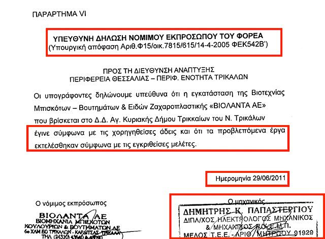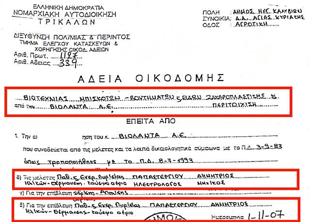 Στη δικογραφία περιλαμβάνεται σειρά εγγράφων – τα οποία παρουσιάζουν «ΤΑ ΝΕΑ» – όπως αυτό με ημερομηνία 29 Ιουνίου 2011, με υπεύθυνη δήλωση του Παπαστεργίου ως υπεύθυνου μηχανικού ότι όλο το έργο «έγινε σύμφωνα με τις χορηγηθείσες άδειες» και ότι «τα προβλεπόμενα έργα εκτελέστηκαν σύμφωνα με τις εγκριθείσες μελέτες»