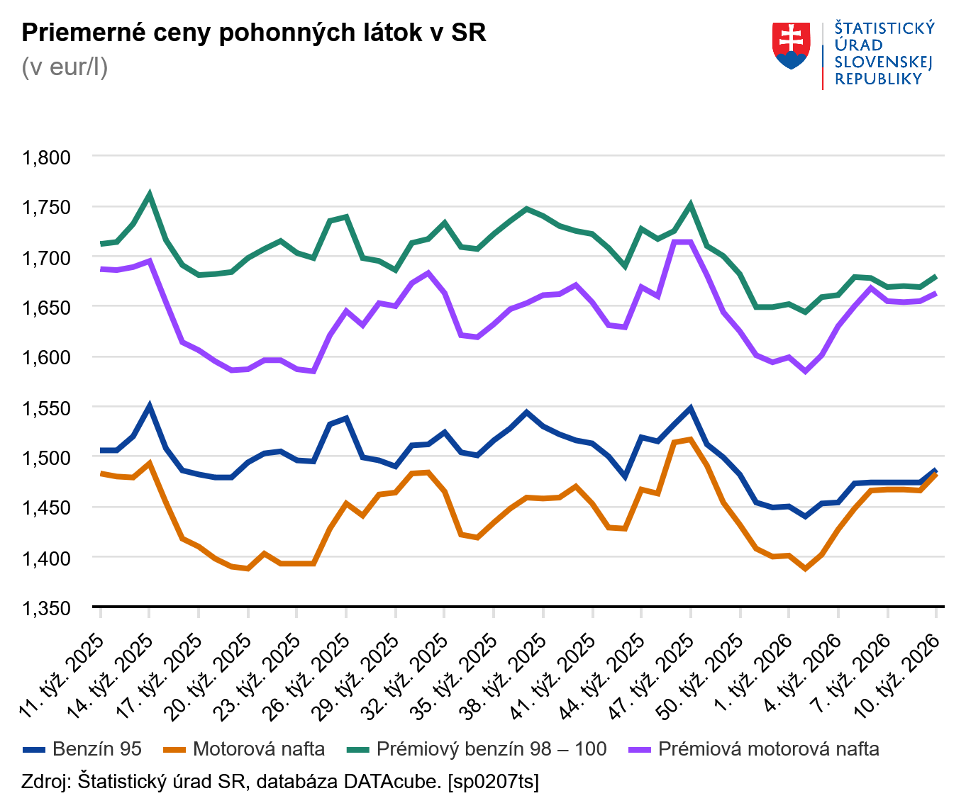 Cena 95-oktánového benzínu vzrástla o 1,3 centa na 1,487 eura za liter a cena 98-oktánového benzínu sa zvýšila o 1,5 centa na 1,654 eura/l. Aktuálne ceny palív zostali pod úrovňou spred roka, benzín 95 o 3,6 percenta, prémiové benzíny o 3,8 percenta, nafta o 2,6 percenta.