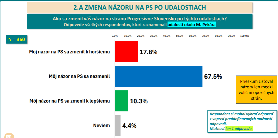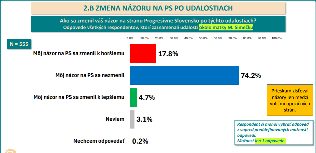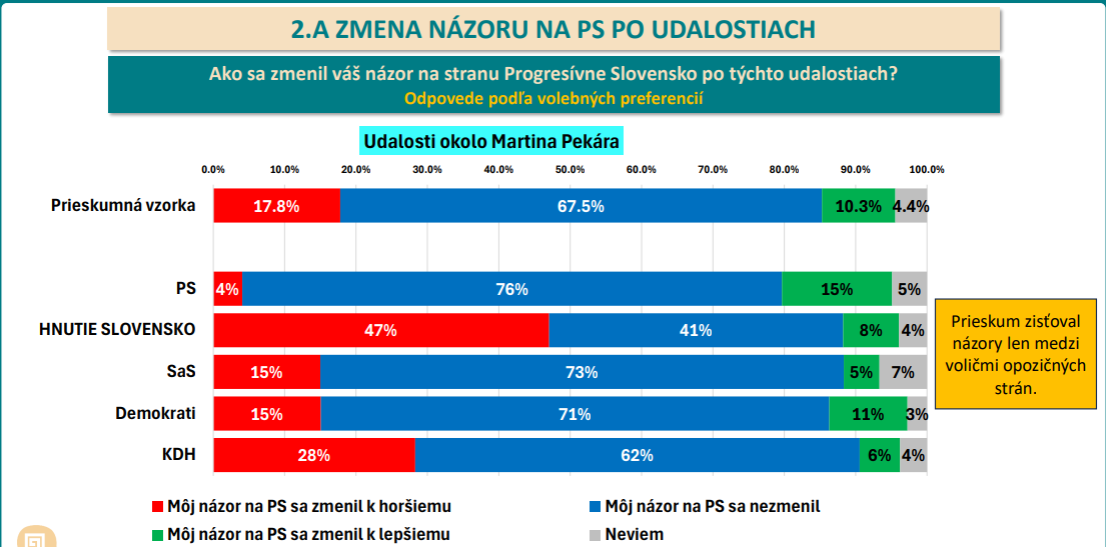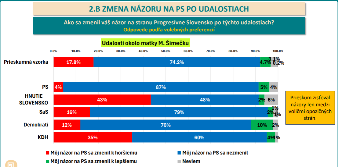Až 17,8 percenta voličov opozičných strán zahrnutých v prieskume - PS, Hnutie Slovensko, SaS, Demokrati a KDH - uviedlo, že sa ich názor na progresívcov zhoršil vplyvom dvoch káuz.