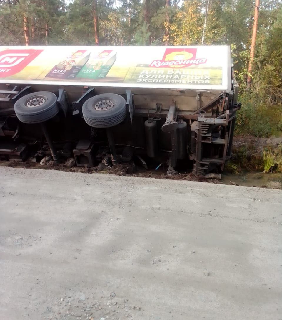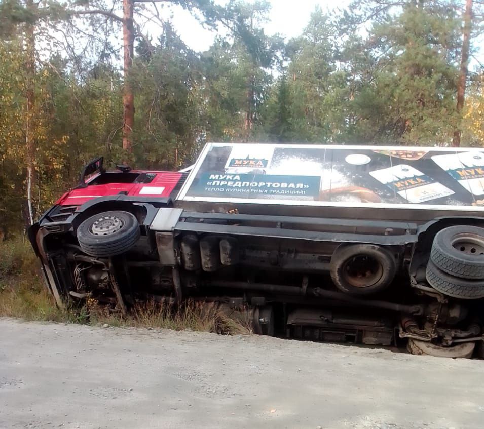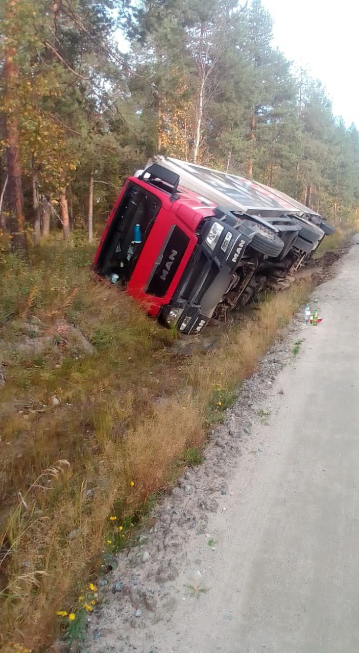 Авария случилась вчера в 14.26 на 62 км дороги «Кемь — Калевала». Грузовик съехал с дороги и завалился на бок.