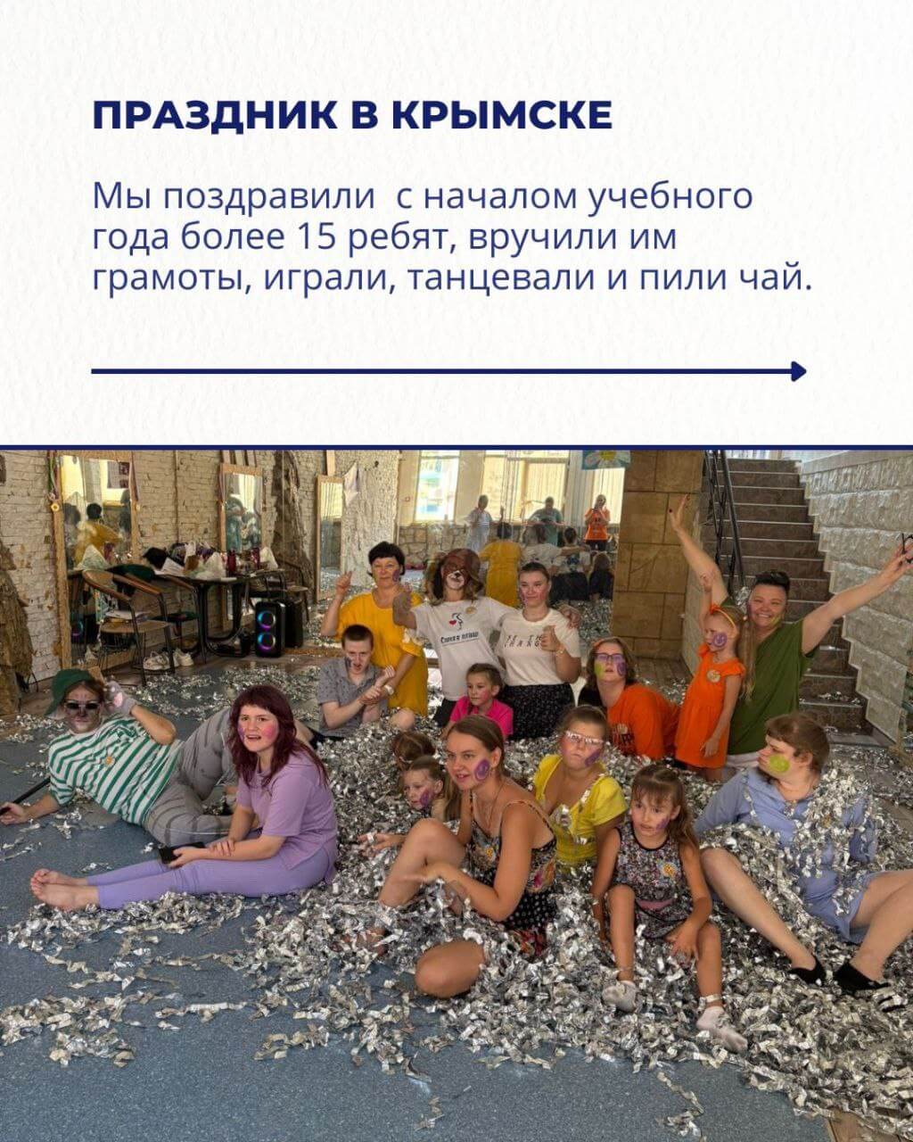 Каждое событие, о котором мы расскажем в карусели, стало возможным благодаря смелости и отзывчивости наших гостей и партнёров. Оказывая помощь, вы дарите детям не просто своё внимание, но возможности для развития, радость общения и уверенность в своих силах. Искренне благодарим вас за это!