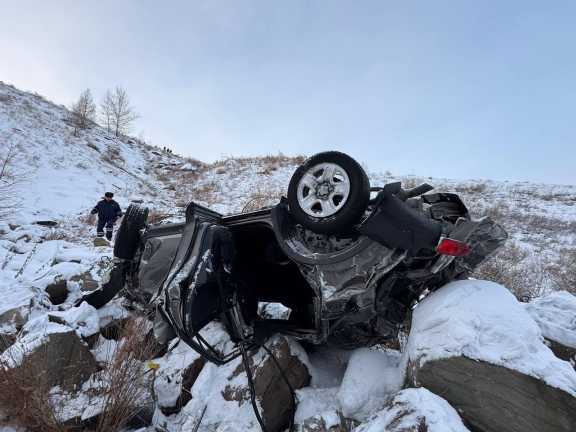 Машина опрокинулась в обрыв, но пассажирам и водителю удалось пережить падение.