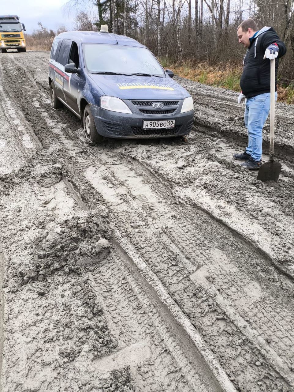 Автомобиль «Почты России» застрял на ужасной дороге в Карелии