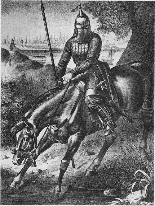 Русское вооружение с XIV до второй половины XVII столетия. Ратник в бахтерце и в шишаке с еловцем. // Историческое описание одежды и вооружения российских войск, под ред. Висковатова А.В., Часть 1. СПб., 1841-1862.