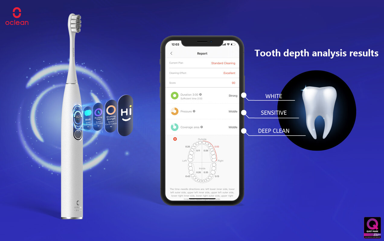Главной особенностью данной зубной щётки является тишина в процессе работы — многие пользователи отказываются от электрощёток именно из-за того, что они сильно шумят. Это может раздражать или даже мешать в быту, но в Oclean X Pro Elite используется фирменная технология шумоподавления, которая позволяет чистить зубы и ротовую полость без излишнего шума. Производитель заявляет, что модель издаёт всего 45 дБ — это чуть громче, чем шепот. При этом, что немаловажно, зубная щётка не уступает конкурентам в плане эффективности очистки зубов — магнитная подвеска вращается со скоростью в 42 000 оборотов в минуту, а специальные нити DuPont эффективно удаляют налёт.