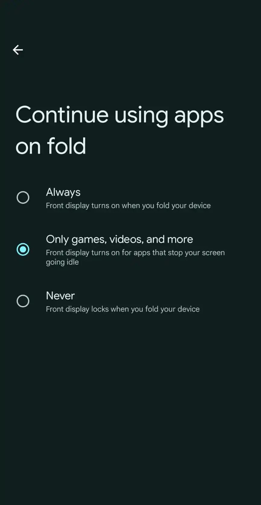 В Google позаботились о владельцах складных смартфонов Pixel Fold бренда и позволили использовать внешний дисплей для воспроизведения медиаконтента и игр, не давая ему уходить в режим сна. В настройках системы пользователи могут выбрать один из трёх вариантов использования внешнего экрана при складывании смартфона: использовать всегда, использовать для игр и медиаконтента и блокировать