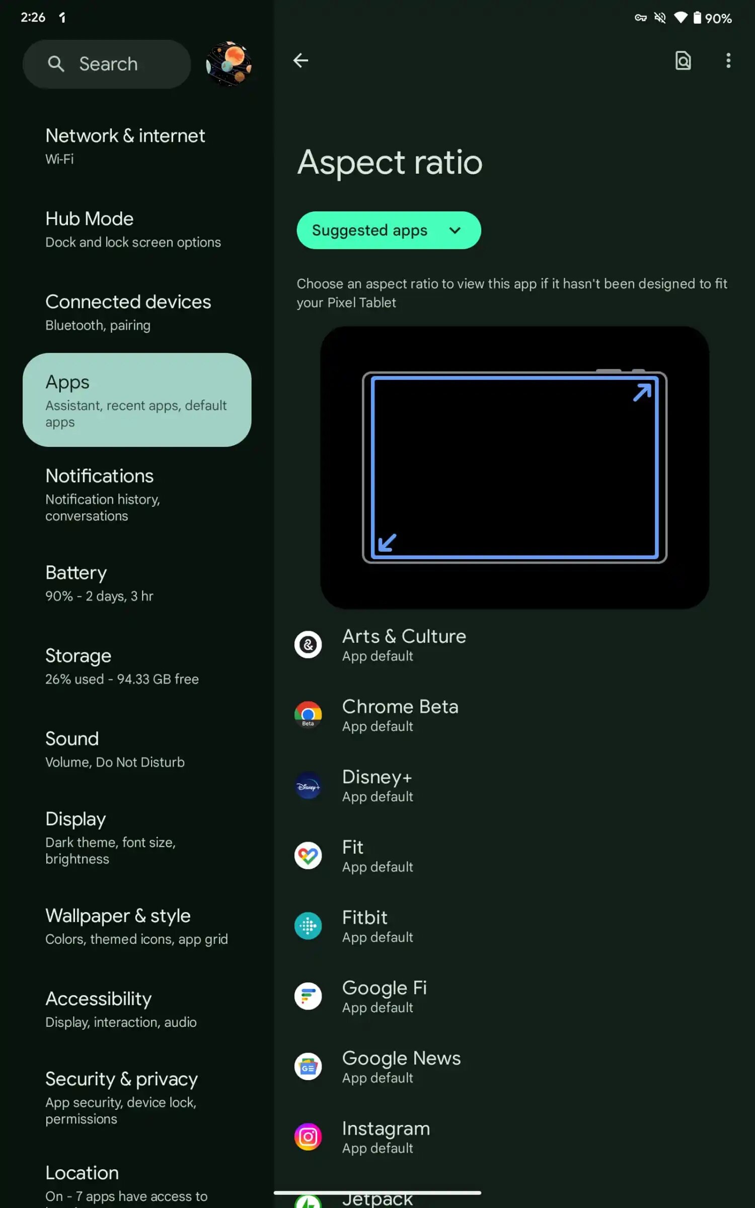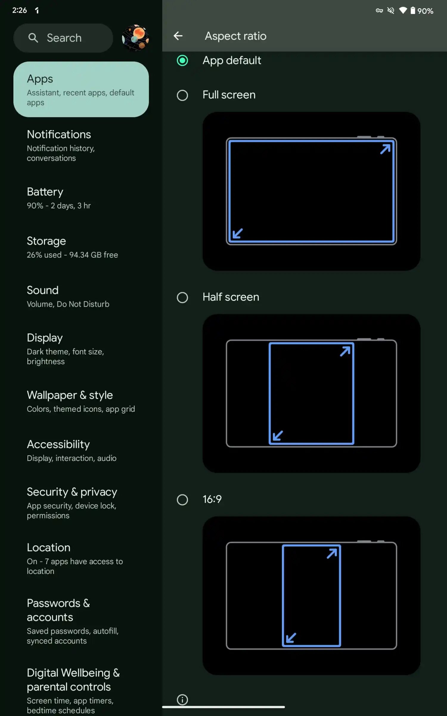 Интересным нововведением можно назвать возможность выбора пропорции отображения окна для каждого приложения.