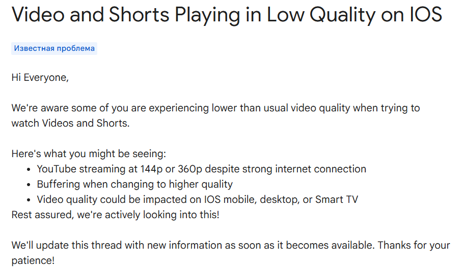 Reddit-dəki çoxsaylı şərhlərə görə, video hostingindəki nasazlıq iPhone və iPad istifadəçilərini, eləcə də YouTube-ukompüterlərdə və ağıllı televizorlarda izləyənləri təsir edib. Eyni zamanda, Android əməliyyat sistemi ilə işləyən smartfonlar və planşetlərdə heç bir problem müşahidə olunmur.