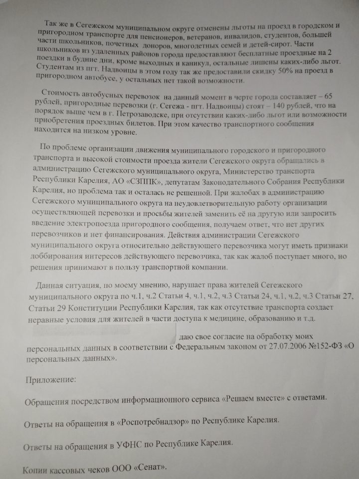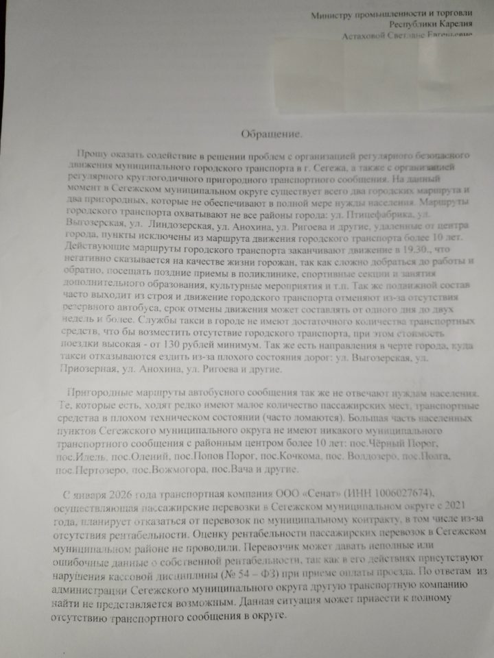 Также проблемой является автобусный маршрут № 101 «Сегежа — поселок Валдай». На маршрут купили новый автобус, но вот отладить его стабильную работу все никак не могут.