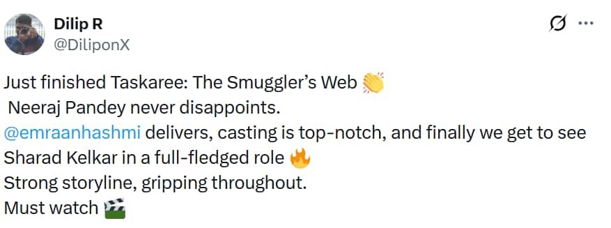 Another user wrote, "Just finished Taskaree: The Smuggler's Web ? Neeraj Pandey never disappoints. @emraanhashmi delivers, casting is top-notch, and finally we get to see Sharad Kelkar in a full-fledged role ? Strong storyline, gripping throughout. Must watch ?" Next tweet read, "After bringing forth stories about CBI, Police, R&AW, IB & Army, @neerajpofficial now shows us brilliance of Indian Custom Officers with #TaskareeOnNetflix. Yet again hits it out of the park in direction,screenplay,writing. @FridayStorytel1 @Vipul711 @raghavjairath @NetflixIndia."